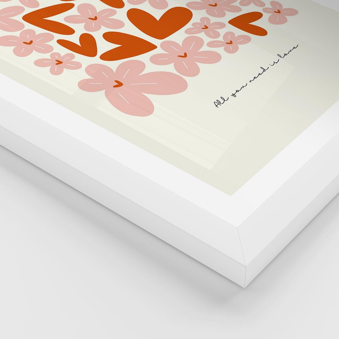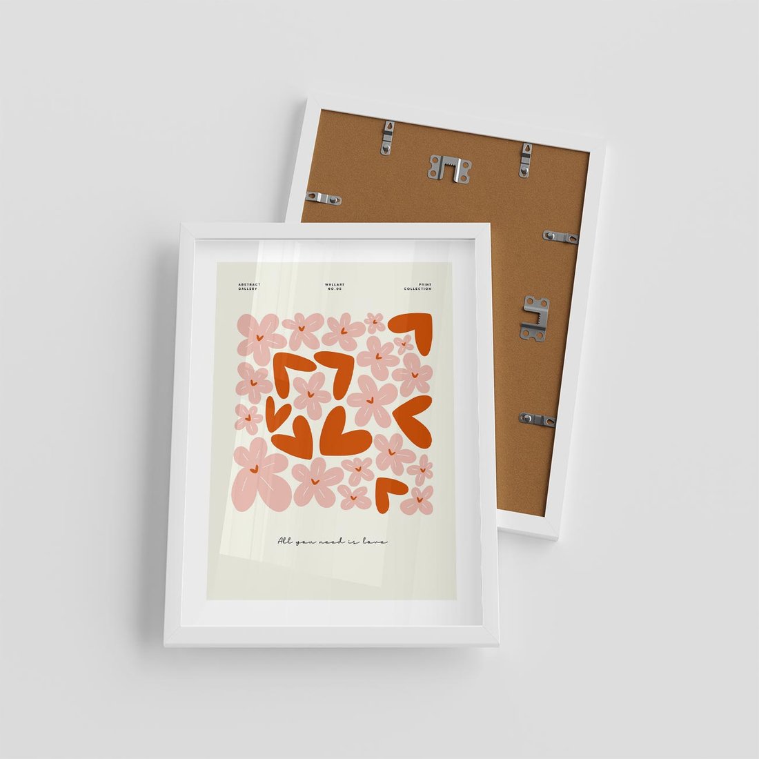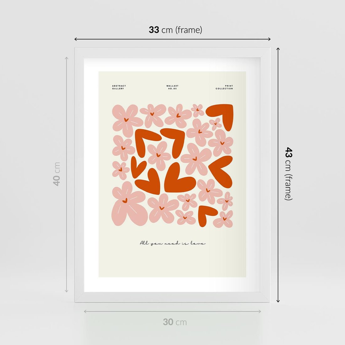 Plakat w ramie 30x40 - Miłość w Kompozycji - grafika, kompozycja kwiaty i serca - rama biała