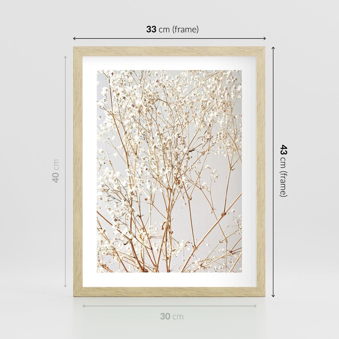 Plakat w ramie 30x40 - Minimalistyczna Delikatność - białe kwiaty, gipsówka - rama drewno