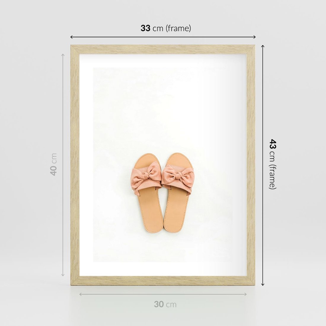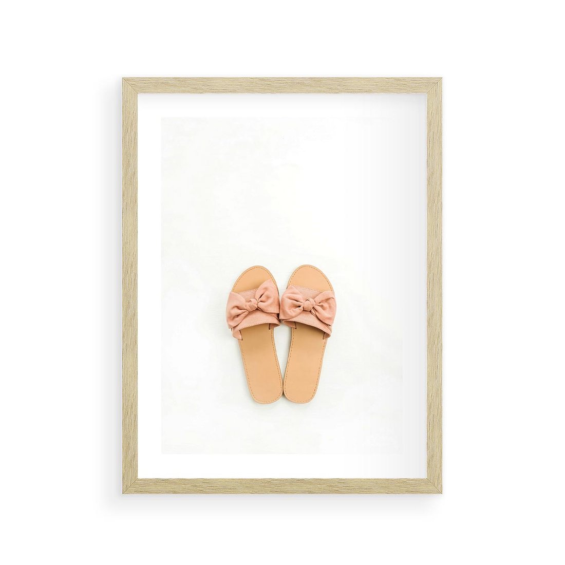 Plakat w ramie 30x40 - Minimalistyczna Moda: Klapki na Białym Tle - klapki, minimalizm - rama drewno