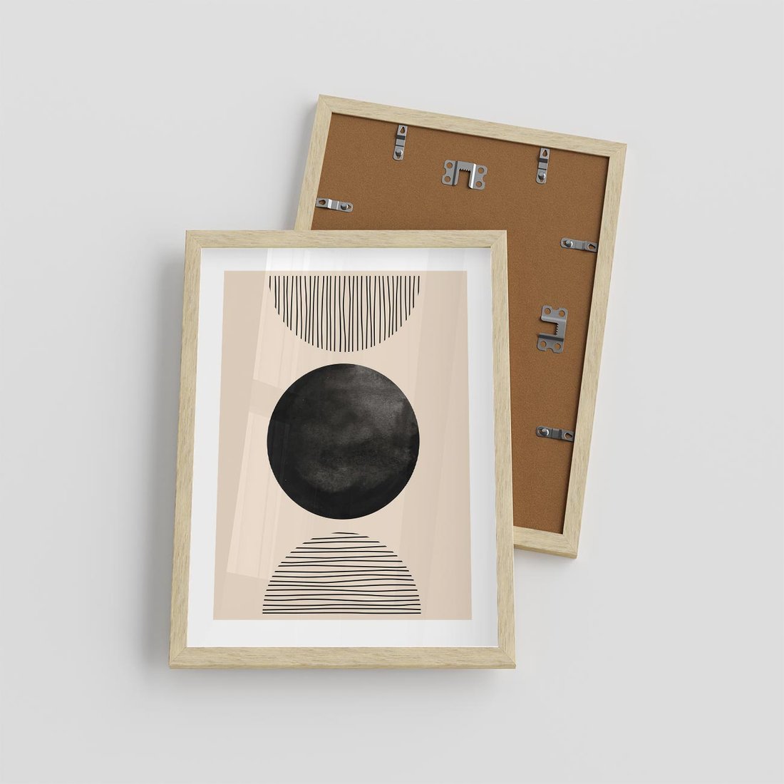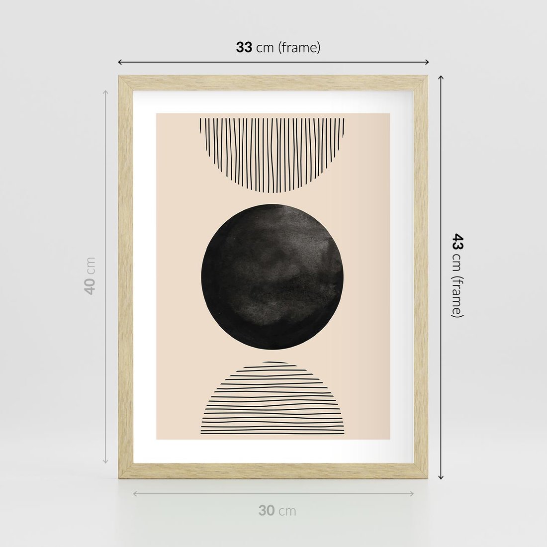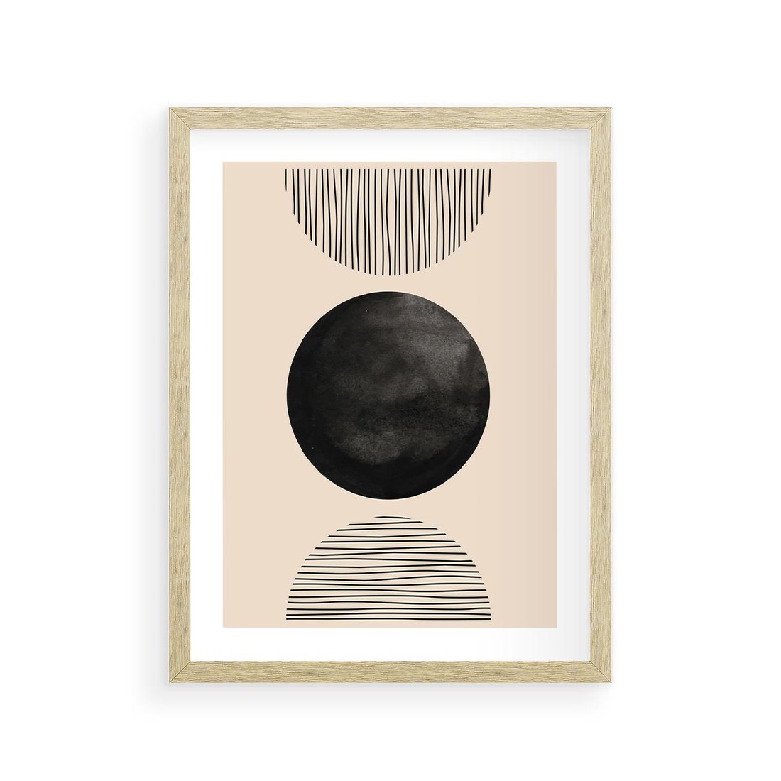 Plakat w ramie 30x40 - Minimalizm w Kształtach - geometryczny graficzny obraz, czarne koło - rama drewno
