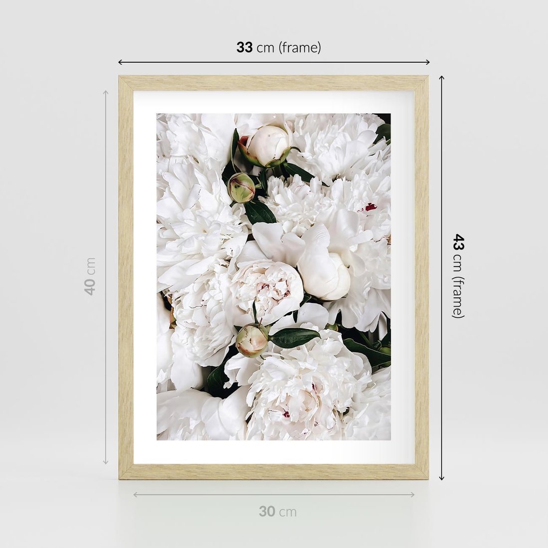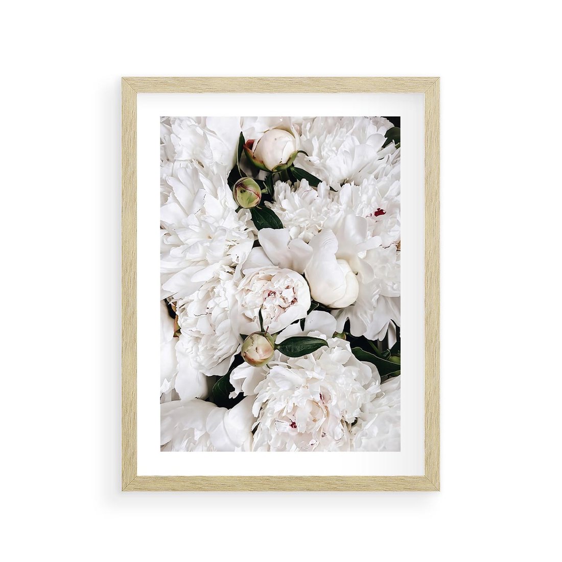 Plakat w ramie 30x40 - Modne Białe Kwiaty - białe kwiaty, płatki - rama drewno