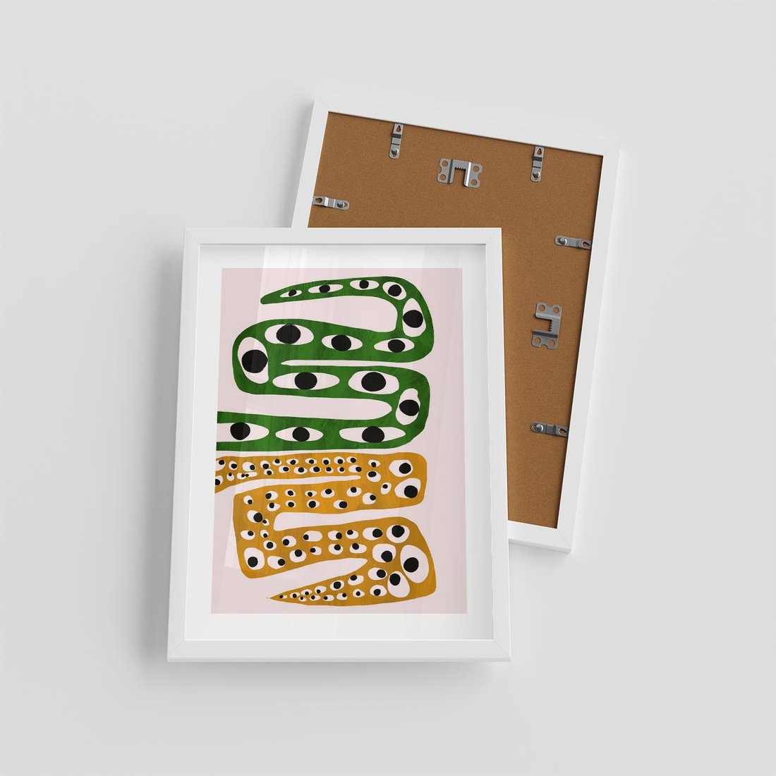 Nasz abstrakcyjny obraz to gra dziwnych kształtów, które przypominają zwinne węże, tańczące w tonacjach żółtego i zielonego. Ta odważna kompozycja wywołuje niezwykłe wrażenie, prowokując do interpretacji i zapraszając do zanurzenia się w nowoczesnej sztuce. To wyjątkowy element dekoracyjny, który wniesie do Twojej przestrzeni energetyczny i zaskakujący akcent.