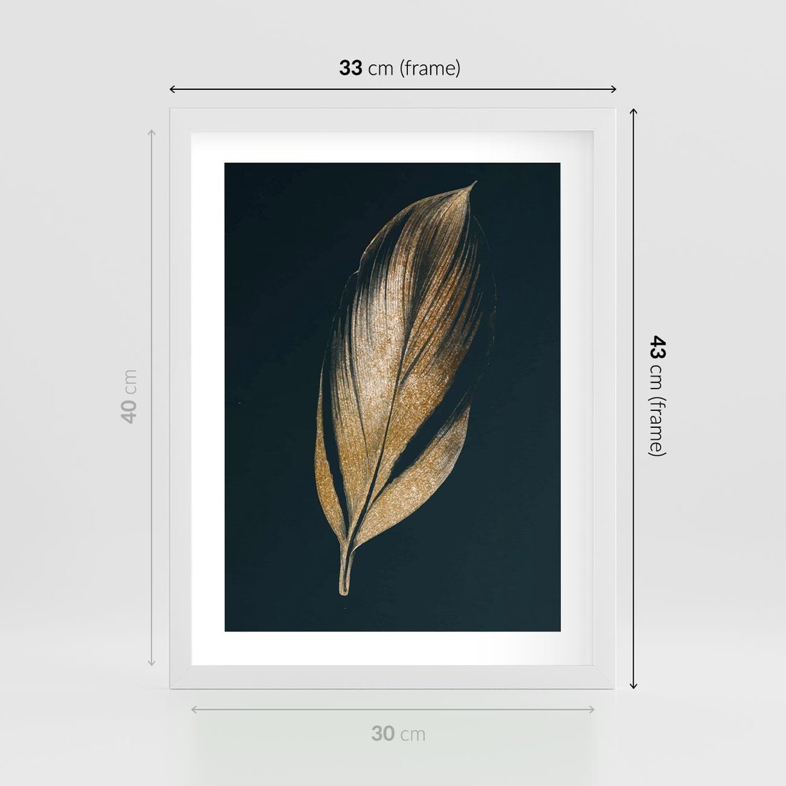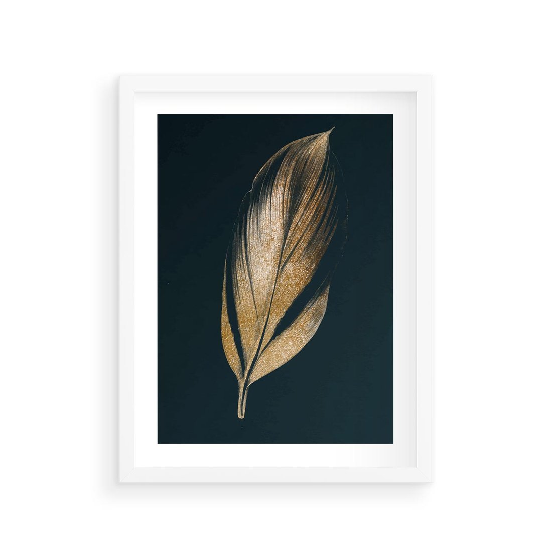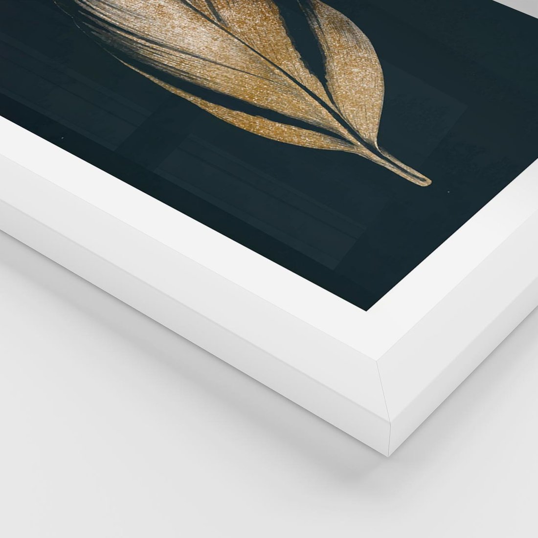 Plakat w ramie 30x40 - Mroczne Złoto - nowoczesna grafika, złoty liść na czarnym tle - rama biała