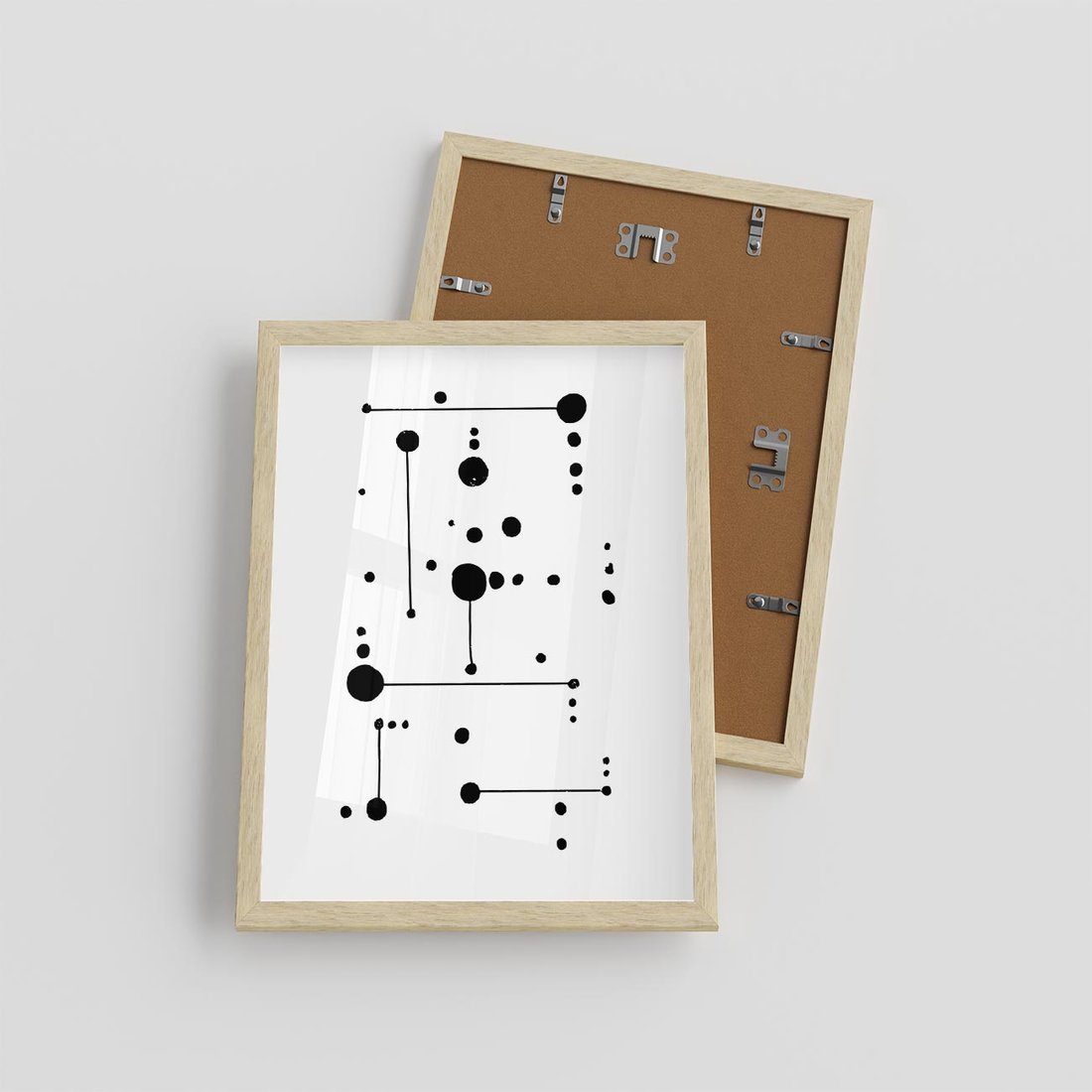 Nasz czarno-biały plakat to doskonałe połączenie abstrakcji i minimalizmu. Zastosowanie kropek i kresek tworzy fascynującą kompozycję, której wyrazistość wynika z kontrastu między czernią a bielą. Ten plakat jest hołdem dla prostoty i głębokich znaczeń, idealny dla miłośników artystycznej subtelności.