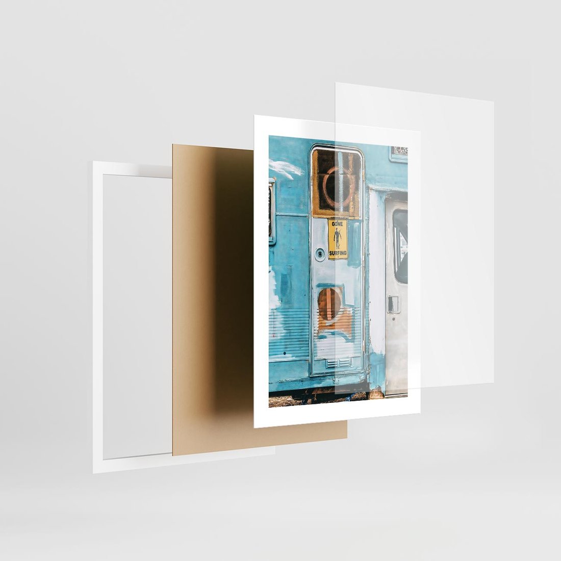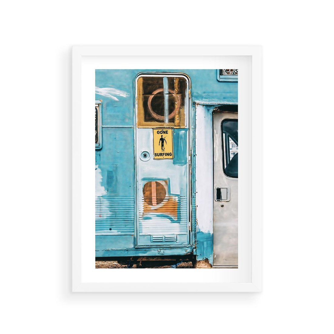 Plakat w ramie 30x40 - Nostalgiczna Podróż - stara przyczepa kempingowa, niebieskie kolory - rama biała
