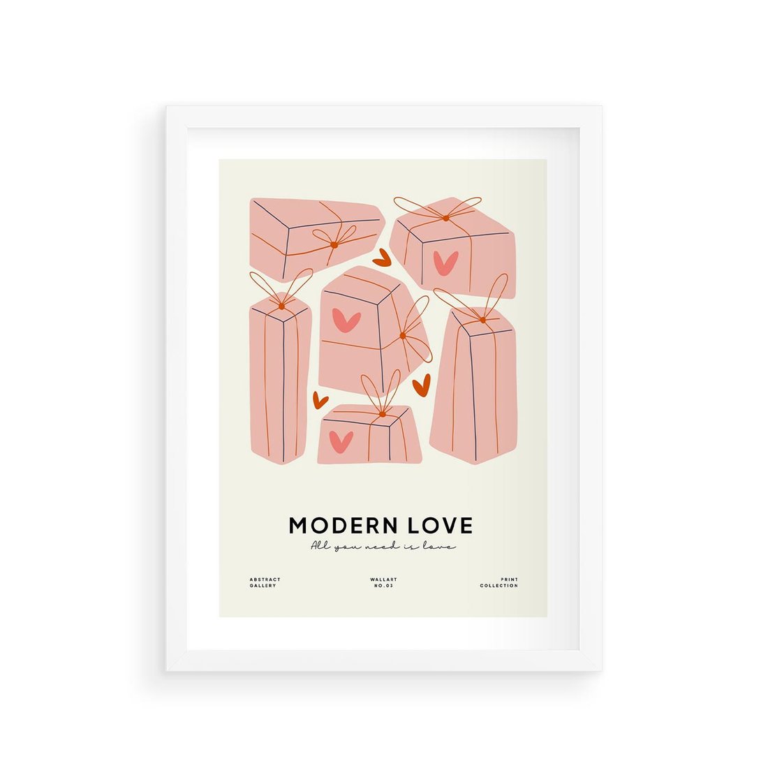 Ta nowoczesna grafika w pastelowych odcieniach ukazuje serduszka i prezenty, tworząc dynamiczną kompozycję. "Nowoczesna Miłość" to hołd dla uczucia w stylu współczesnym, z subtelną typografią "Modern Love". Obraz ten wniesie do wnętrza dawkę radości i romantyzmu, jednocześnie podkreślając nowoczesny charakter miłości.