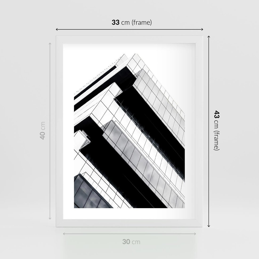 Plakat w ramie 30x40 - Nowoczesna Surowość: Wieżowiec na Czarno-Białej Grafice - architektura, wieżowiec - rama biała