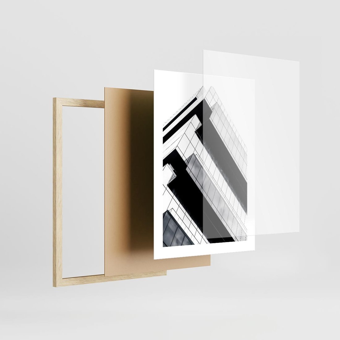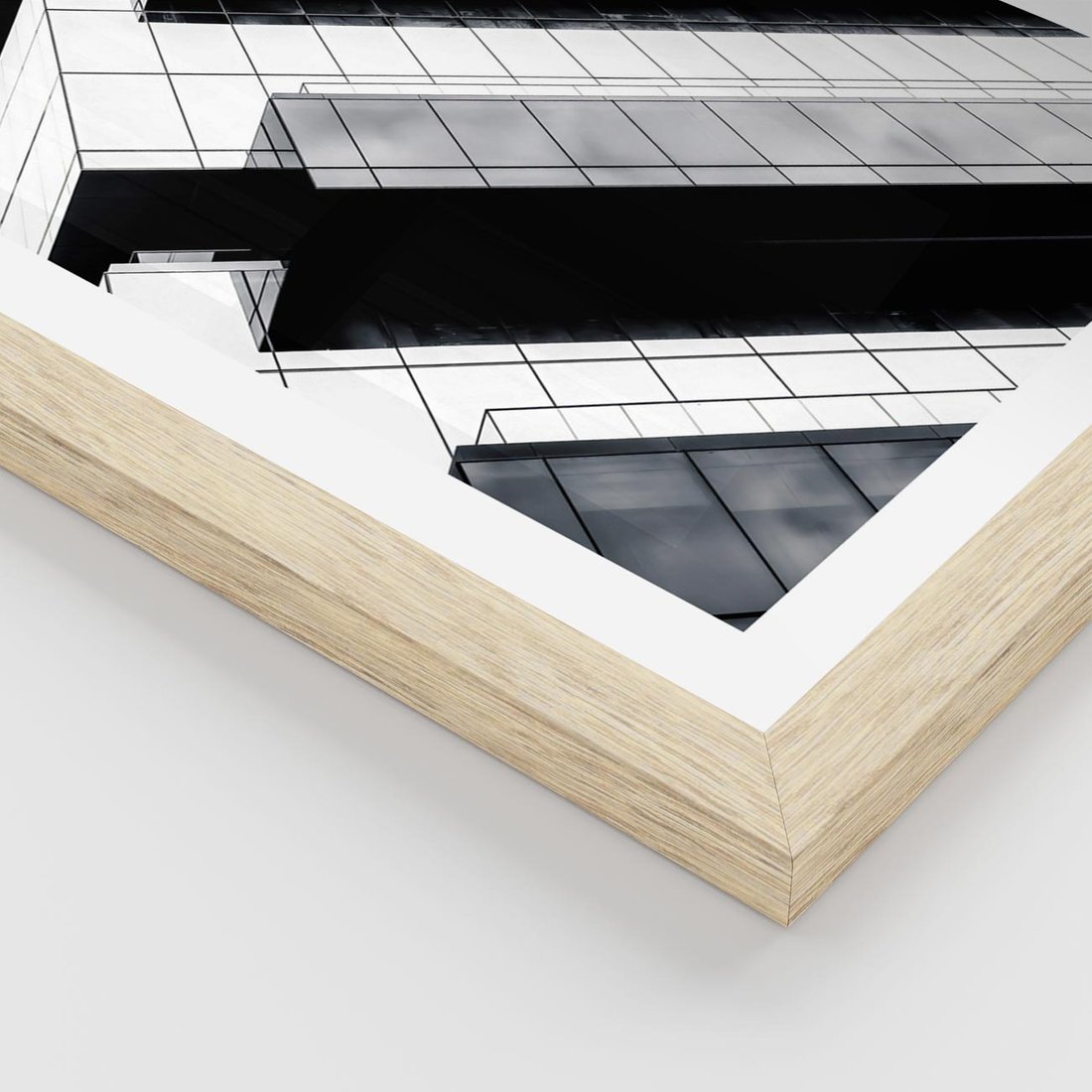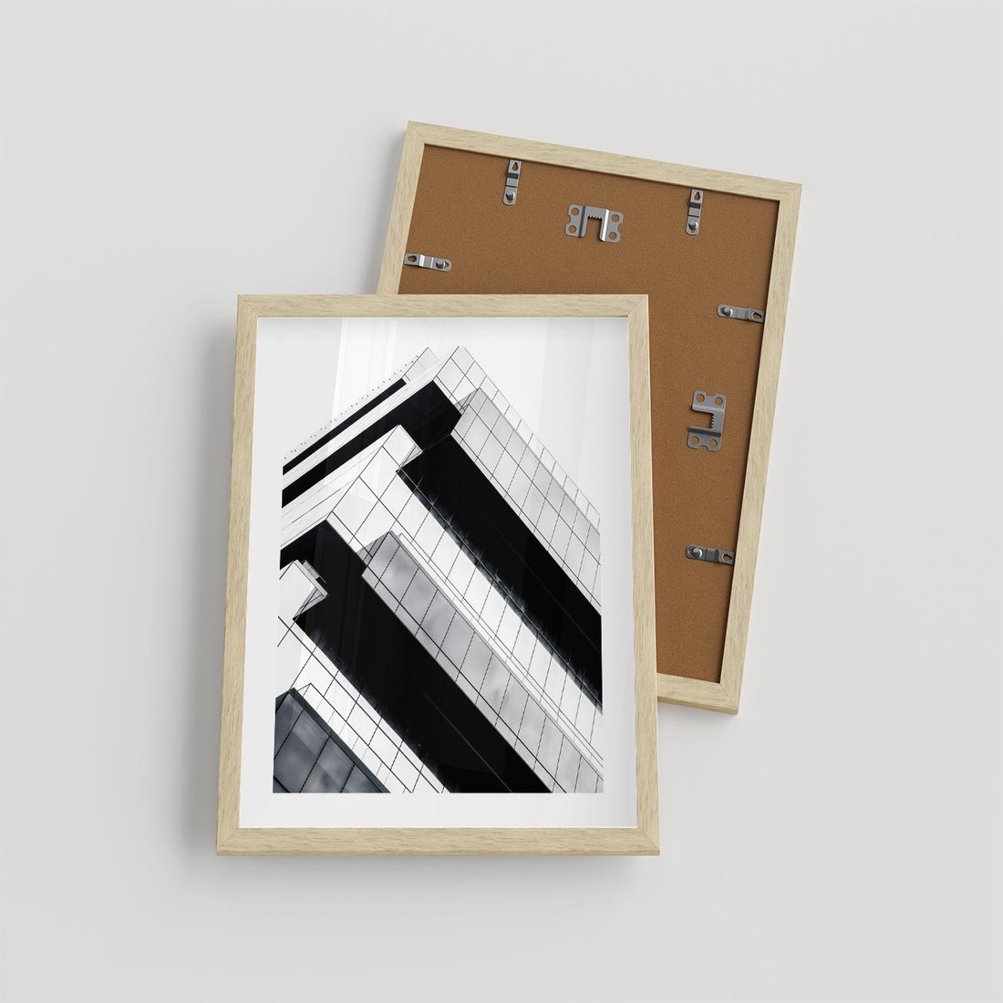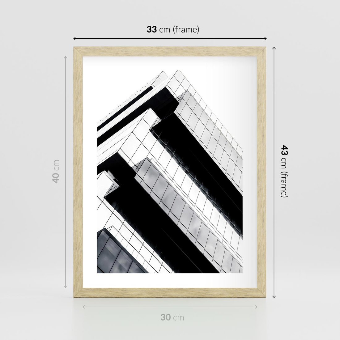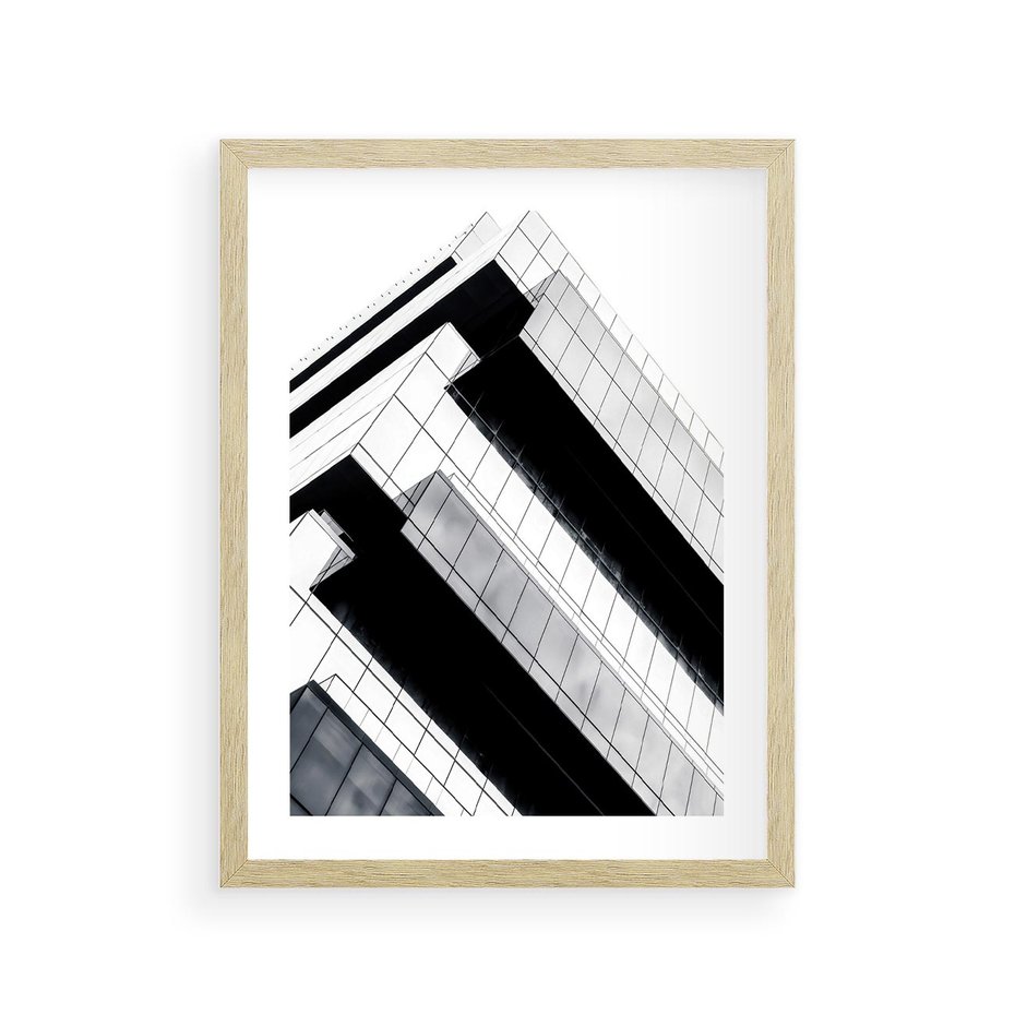 Plakat w ramie 30x40 - Nowoczesna Surowość: Wieżowiec na Czarno-Białej Grafice - architektura, wieżowiec - rama drewno