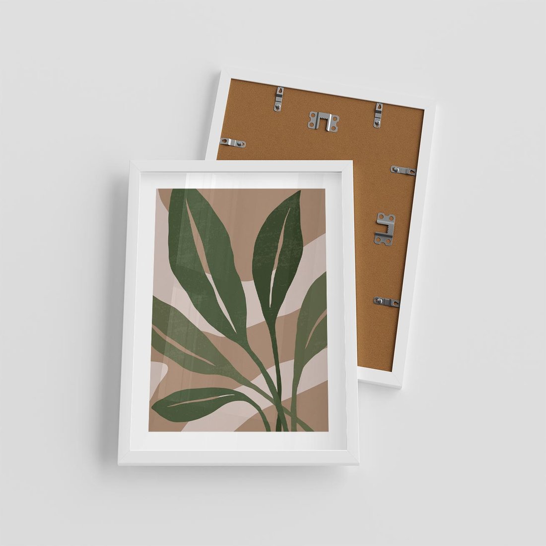 To nowoczesny plakat utrzymany w odcieniach beżu, na którym znajdują się abstrakcyjne, zielone liście. Plakat ten łączy w sobie nowoczesność z naturą, tworząc spójną i harmonijną kompozycję.