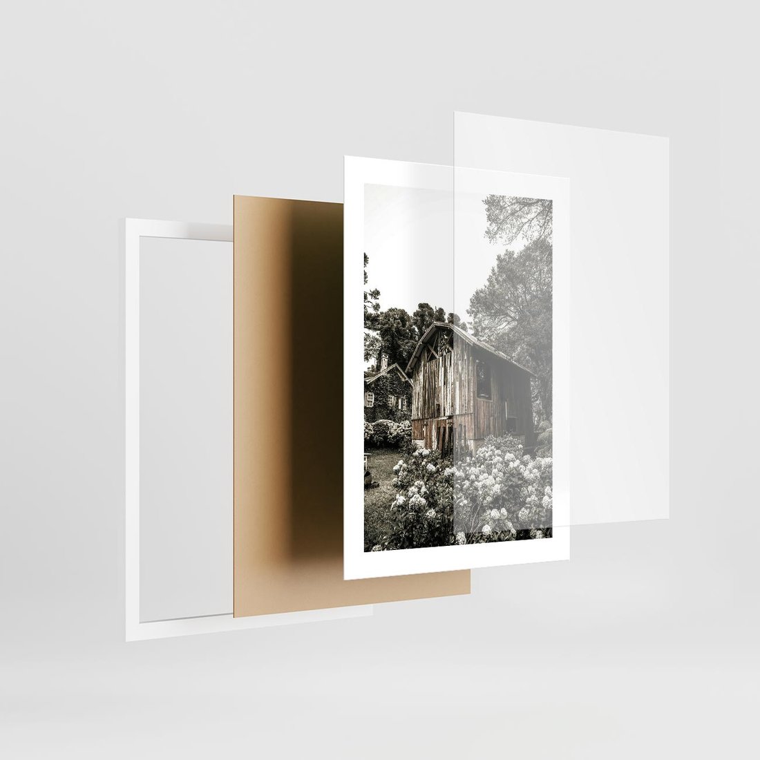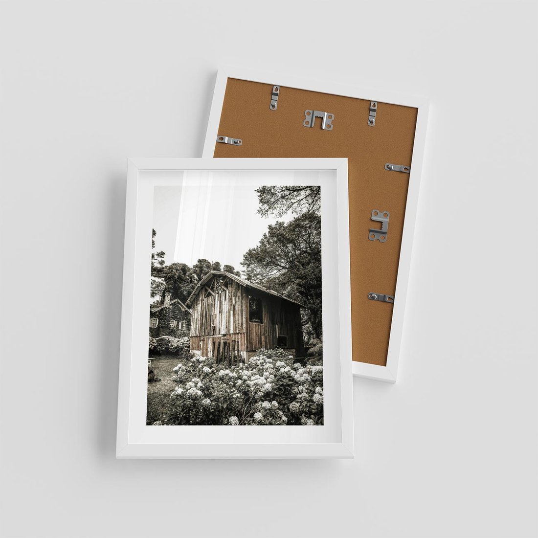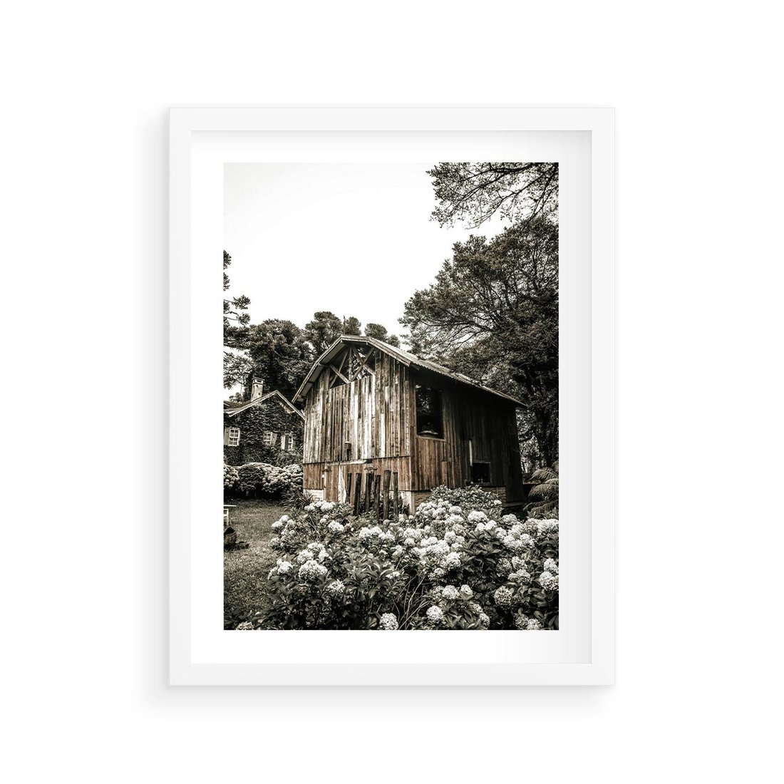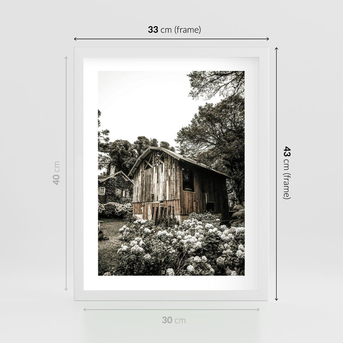 Plakat w ramie 30x40 - Oaza Uroku: Drewniana Chatka i Ogród - domek, ogród - rama biała