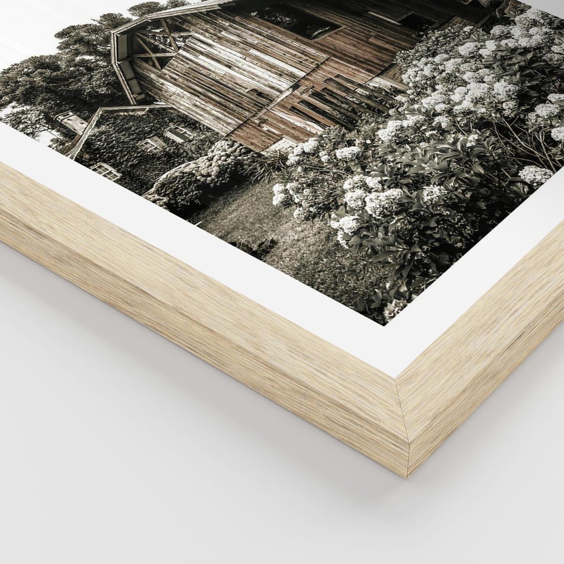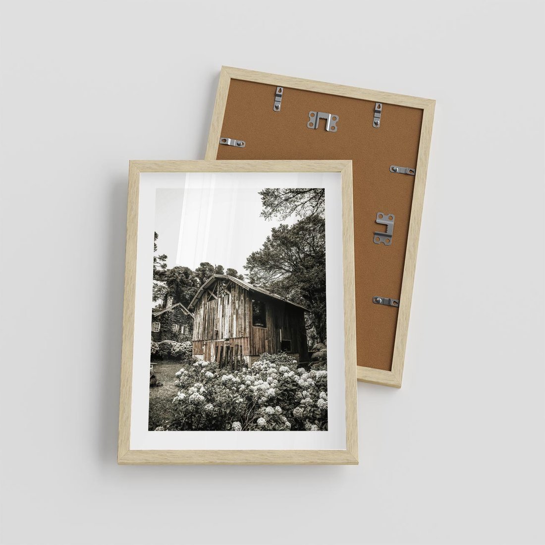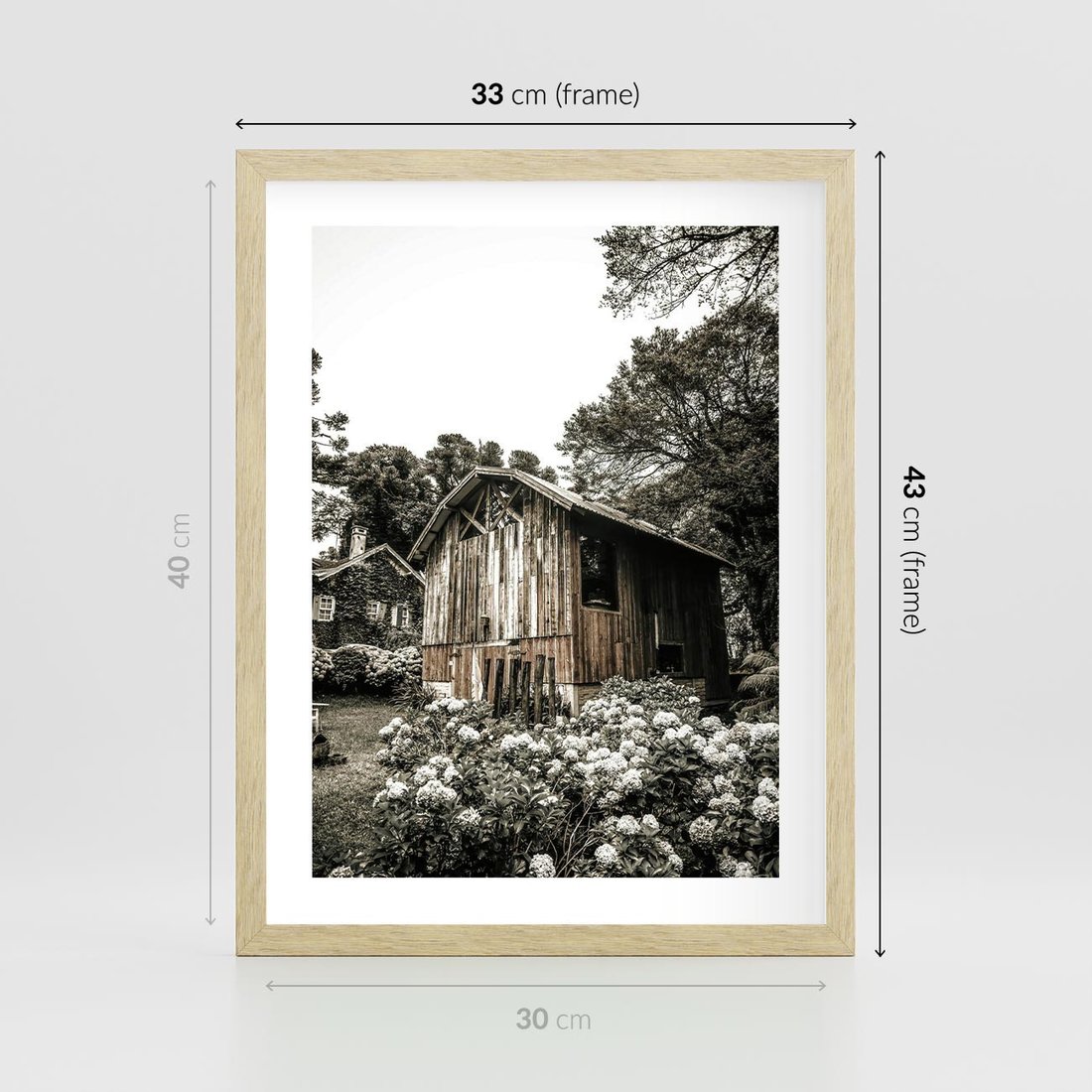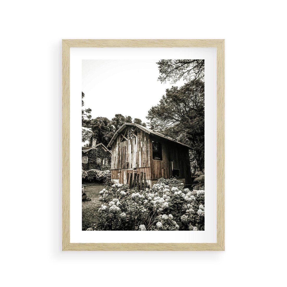 Plakat w ramie 30x40 - Oaza Uroku: Drewniana Chatka i Ogród - domek, ogród - rama drewno