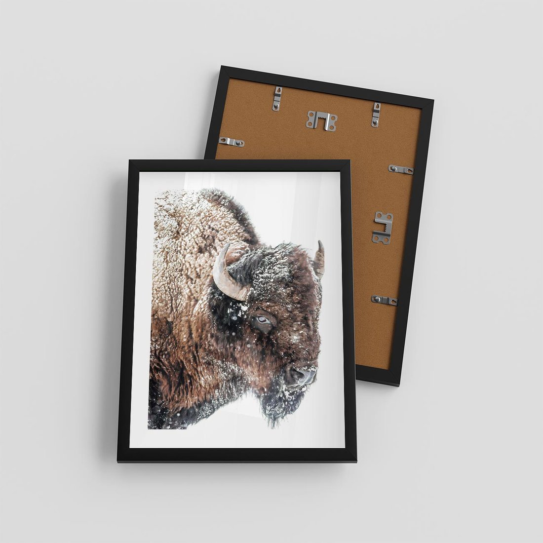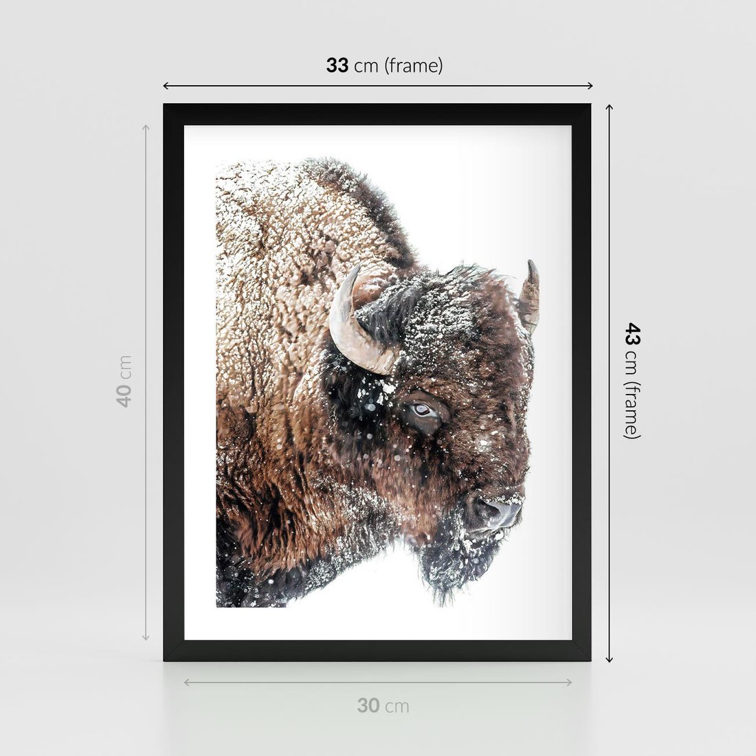 Plakat w ramie 30x40 - Obraz Dzikiej Przyrody w Śnieżnym Otoczeniu - żubr, śnieg - rama czarna