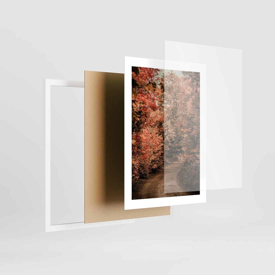 Plakat w ramie 30x40 - Obraz przedstawia jesienne drzewa i czerwone liście na ścieżce w lesie. Ta sceneria doskonale oddaje urok i kolorystykę jesieni w lesie. - las, jesień - rama biała