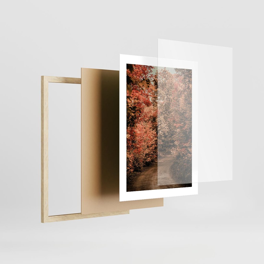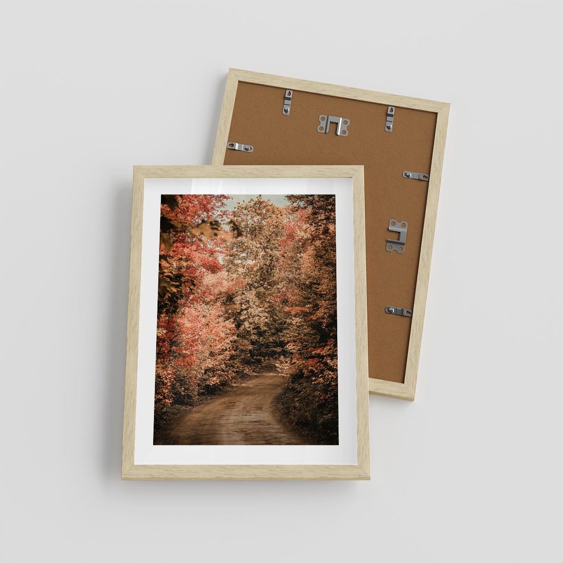 Plakat w ramie 30x40 - Obraz przedstawia jesienne drzewa i czerwone liście na ścieżce w lesie. Ta sceneria doskonale oddaje urok i kolorystykę jesieni w lesie. - las, jesień - rama drewno