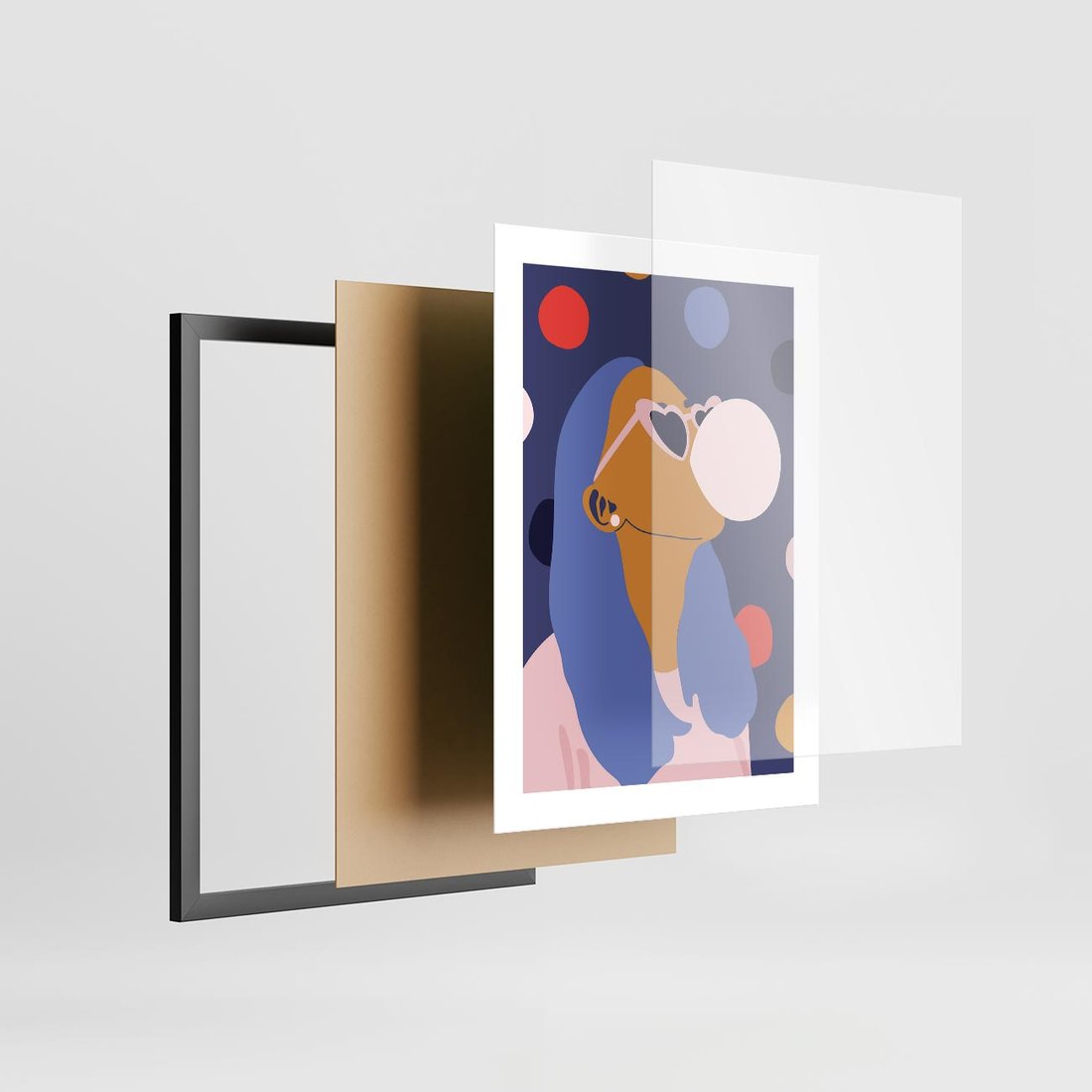 Nowoczesny plakat w stylu retro ukazuje kobietę, która z uśmiechem tworzy balony z gumy. To połączenie nostalgii i nowatorskiego designu, które przynosi wyjątkową atmosferę i radość do Twojego otoczenia.