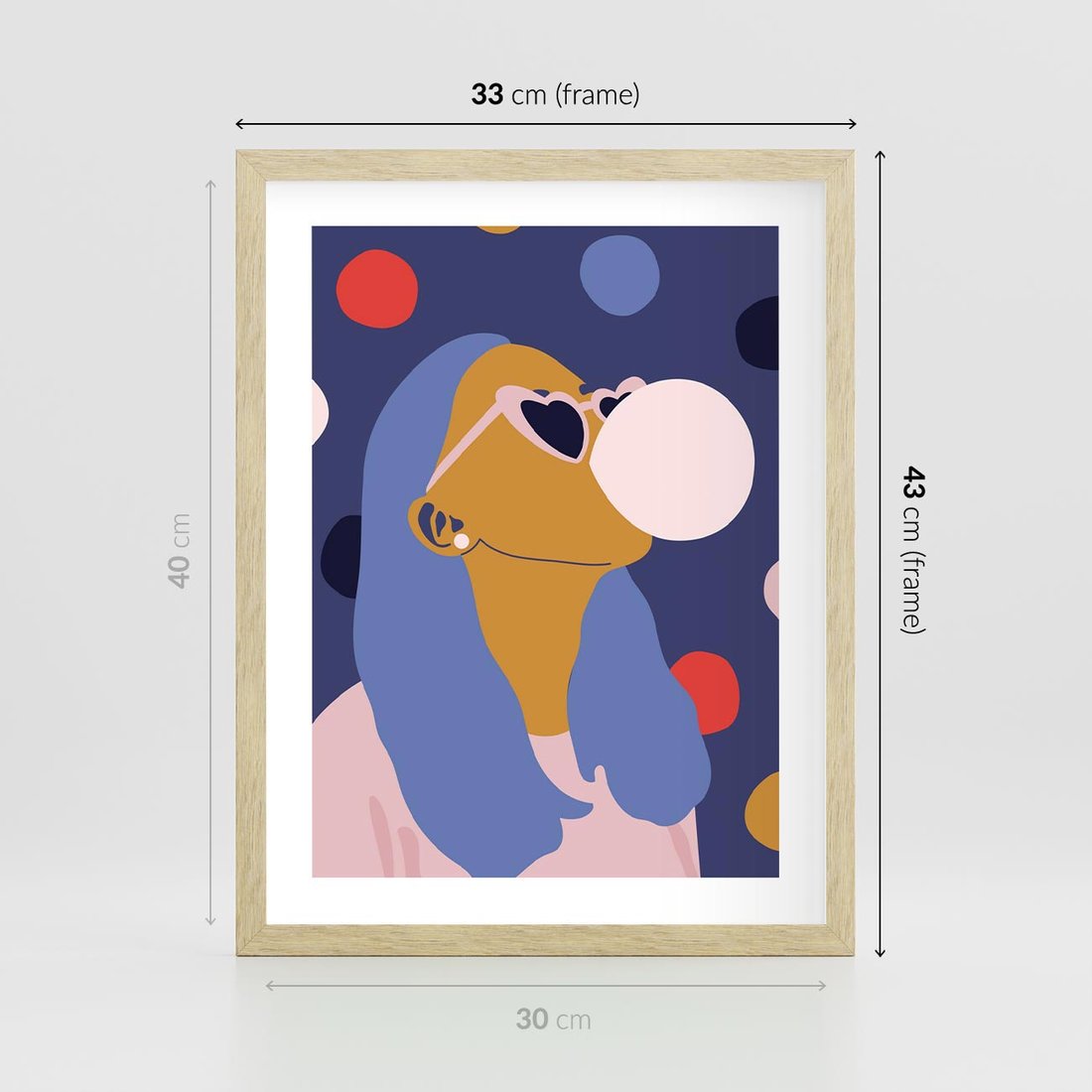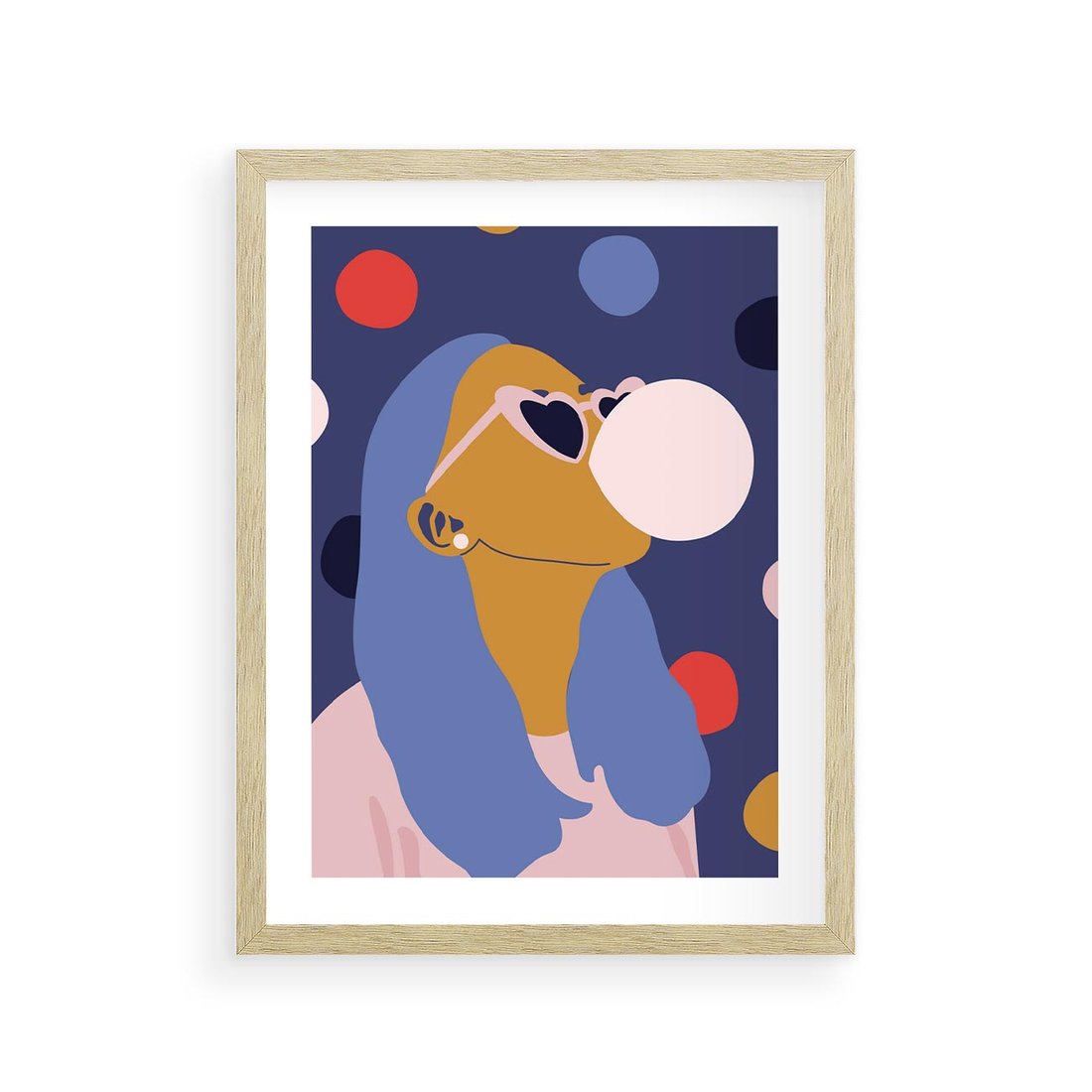 Nowoczesny plakat w stylu retro ukazuje kobietę, która z uśmiechem tworzy balony z gumy. To połączenie nostalgii i nowatorskiego designu, które przynosi wyjątkową atmosferę i radość do Twojego otoczenia.