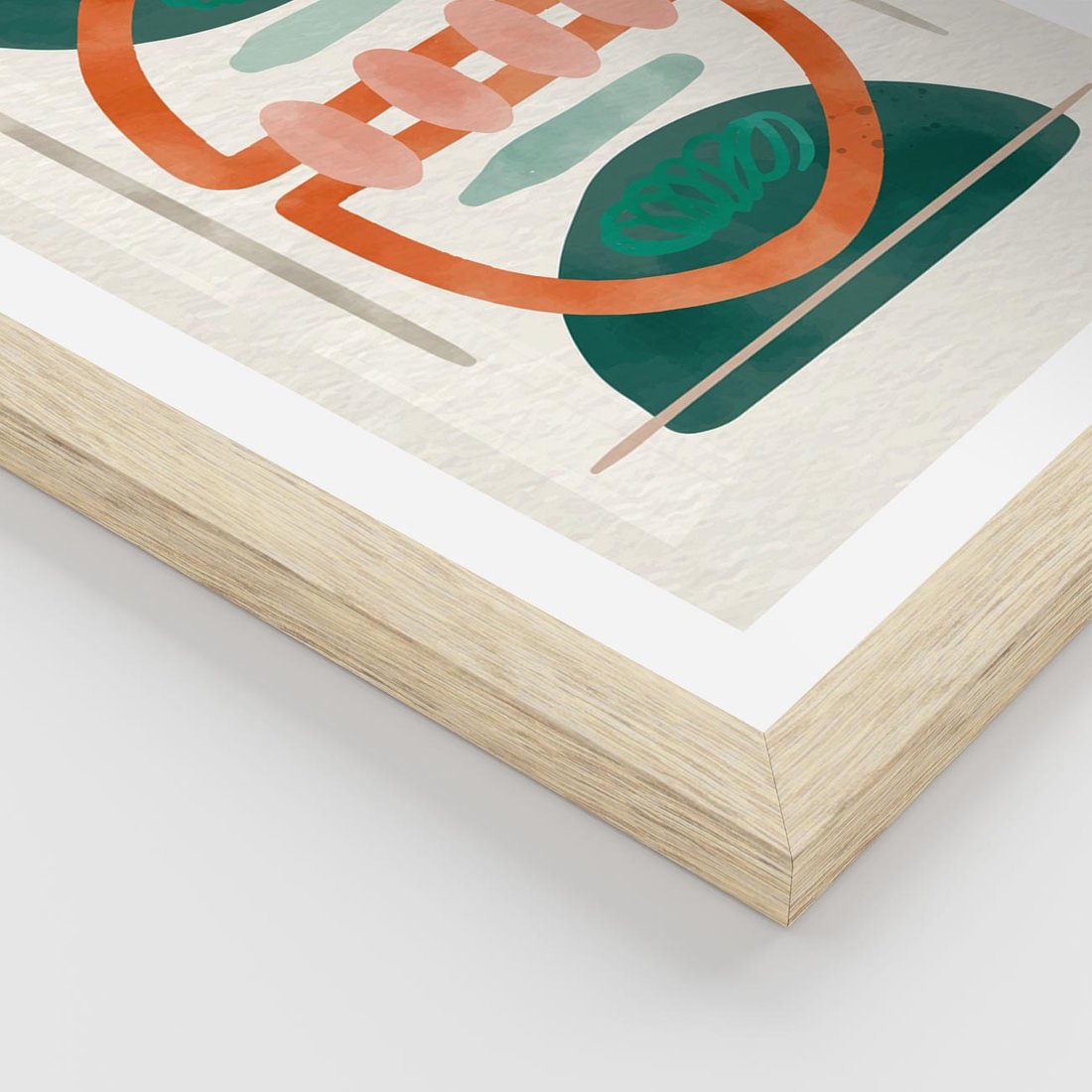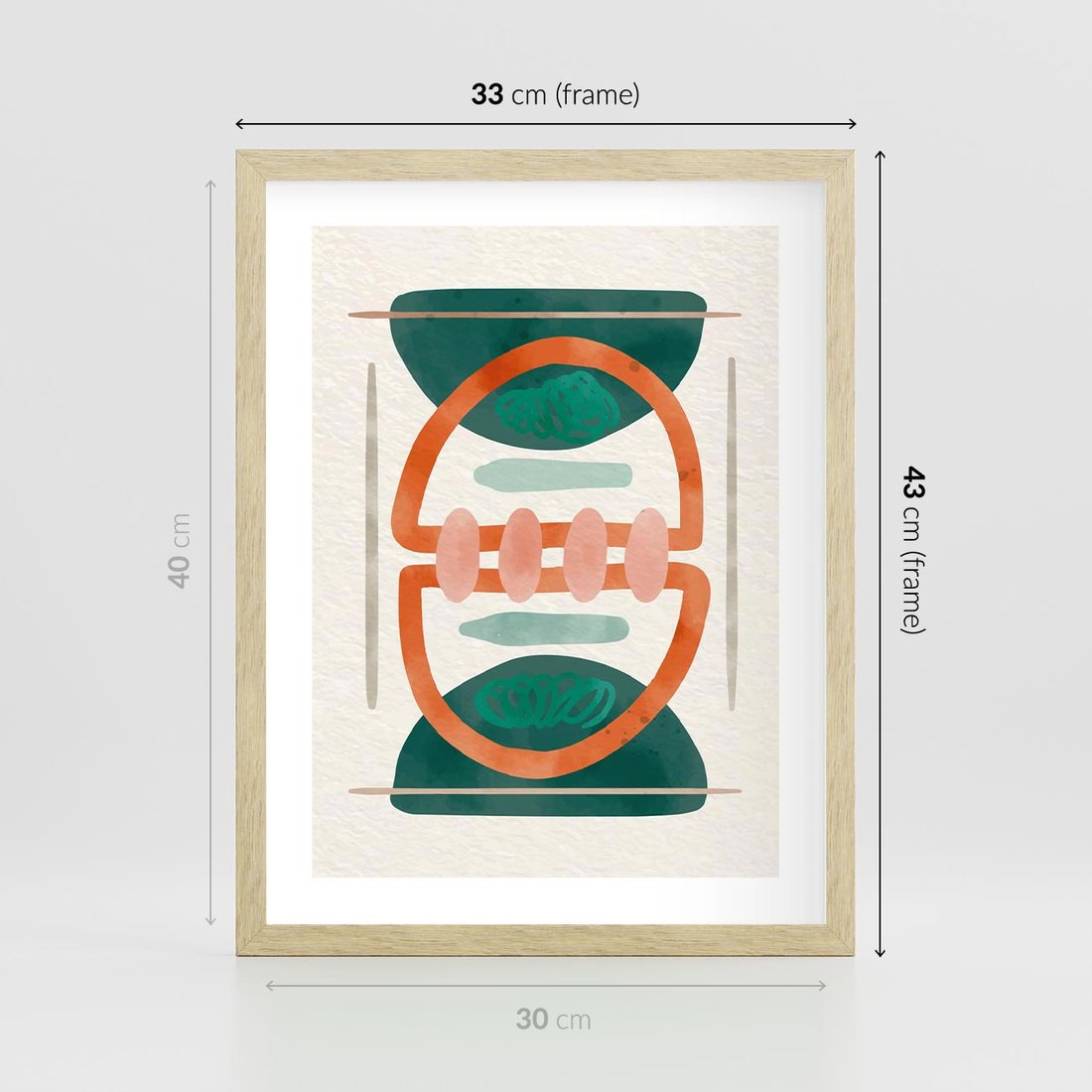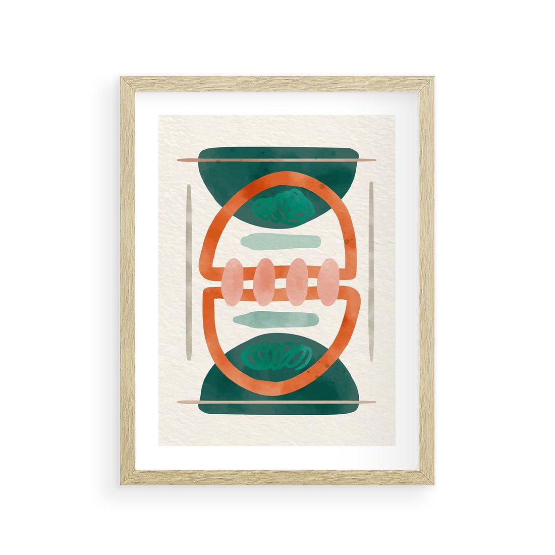 Plakat w ramie 30x40 - Oryginalny obraz abstrakcyjny w nowoczesnym stylu. Geometryczne akwarelowe kształty w intensywnych odcieniach zieleni i pomarańczu. Doskonała dekoracja dla miłośników sztuki. - abstrakcyjny obraz, sztuka nowoczesna - rama drewno