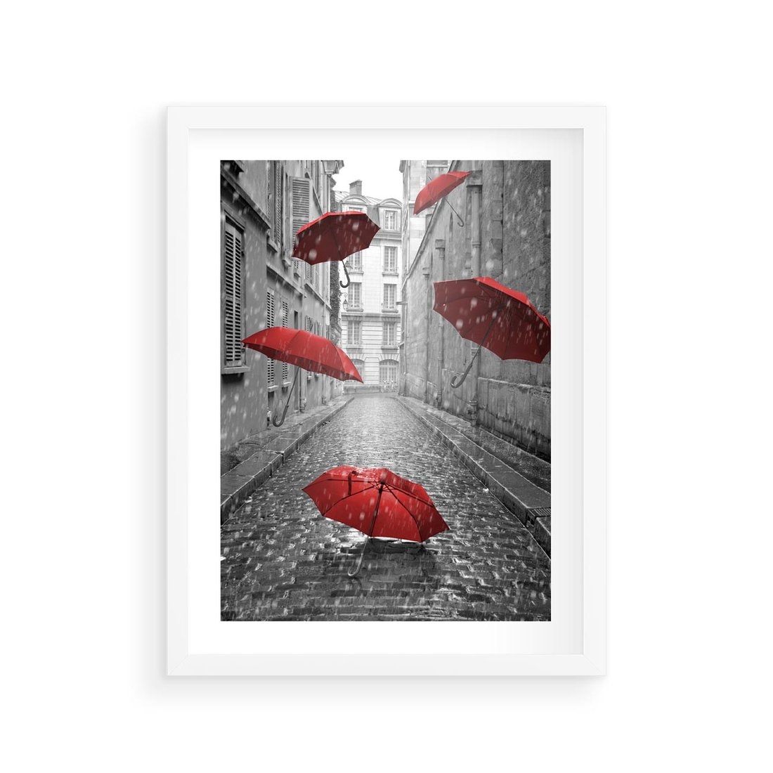 Plakat w ramie 30x40 - Parasole w malowniczej uliczce - parasole, uliczka - rama biała