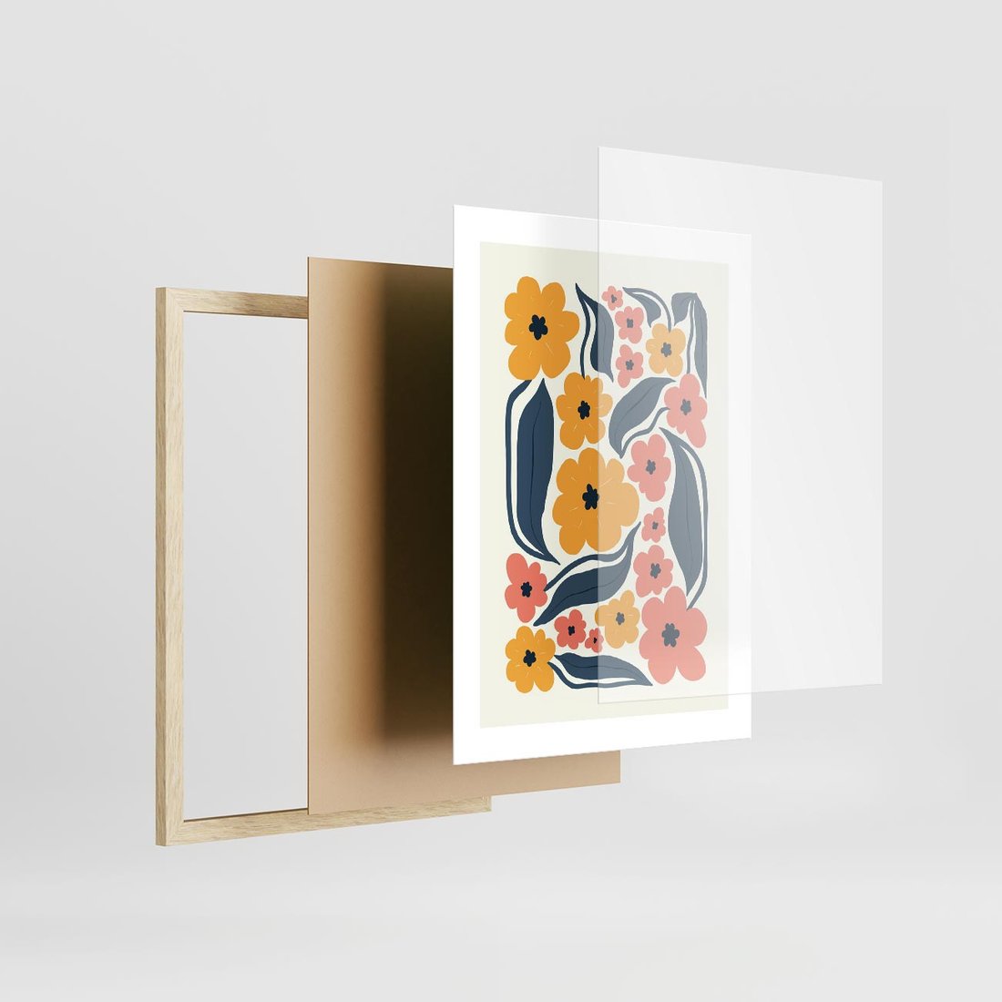 Ten plakat w nowoczesnej sztuce abstrakcji przedstawia pastelowe kwiatowe impresje. Kompozycja tworzy unikalną wizję natury, łącząc delikatność kwiatów z wyrazistą nowoczesnością.