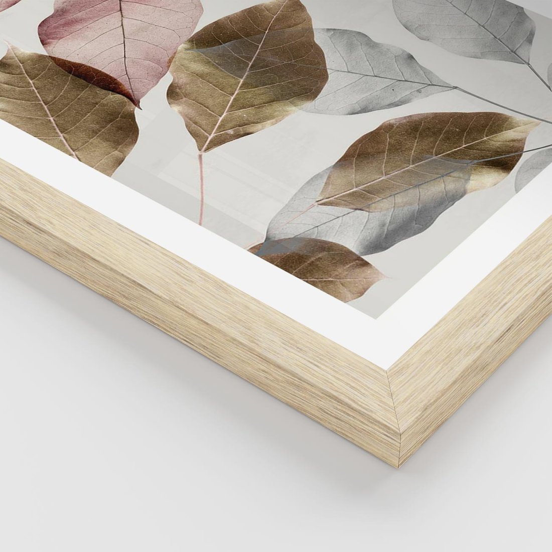 Plakat w ramie 30x40 - Pastelowe Liście z Nutką Złota - liście, pastelowe kolory - rama drewno
