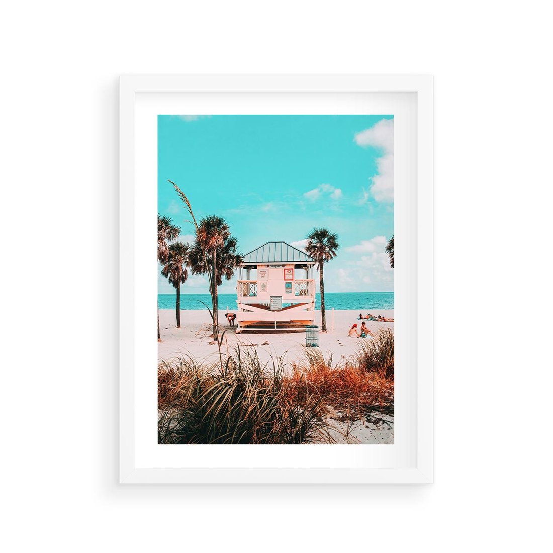 Plakat w ramie 30x40 - Plaża, Palmy i Spokój Miami - budka ratownika, plaża Miami - rama biała