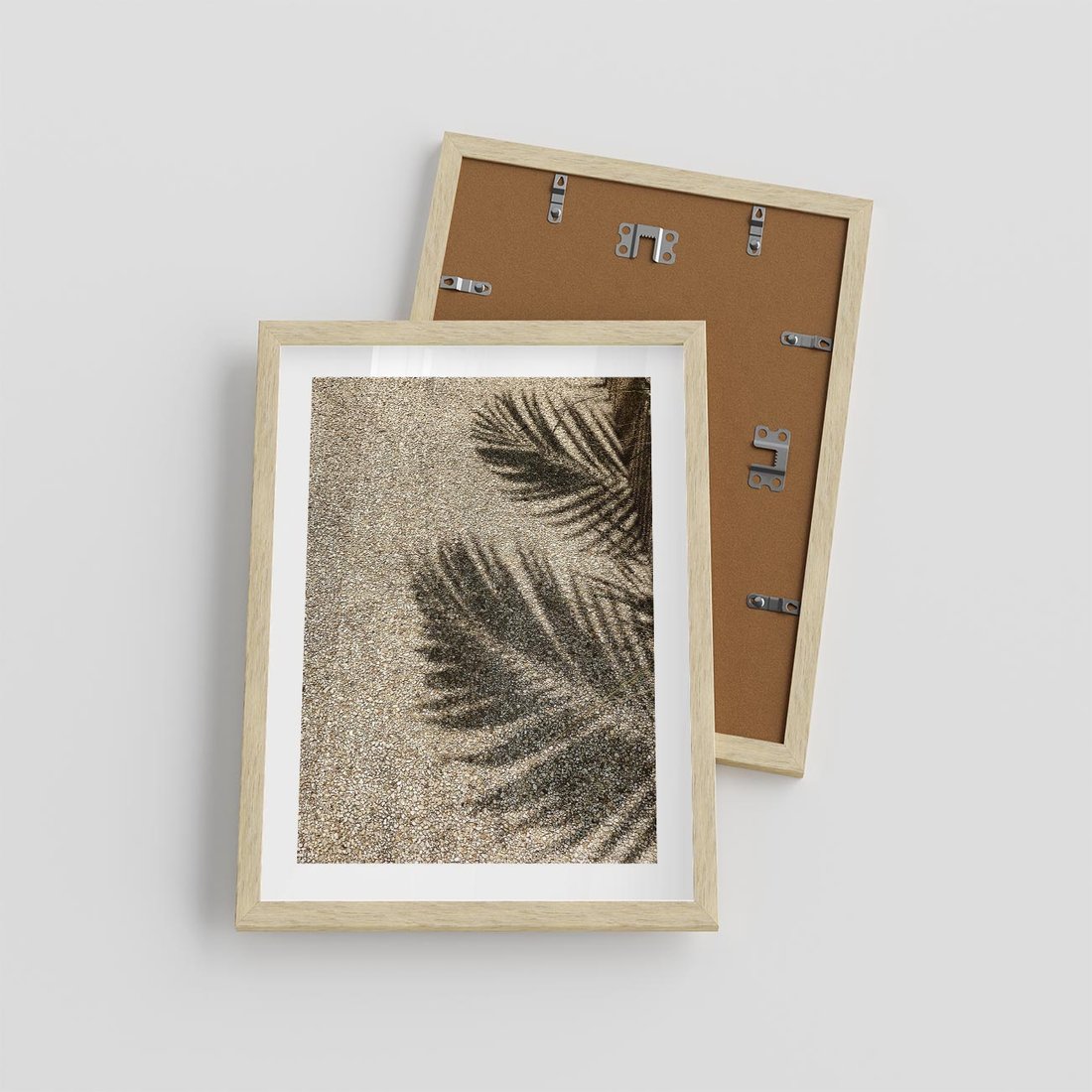 Plakat w ramie 30x40 - Plażowa Idylla - palma, cień na piasku - rama drewno