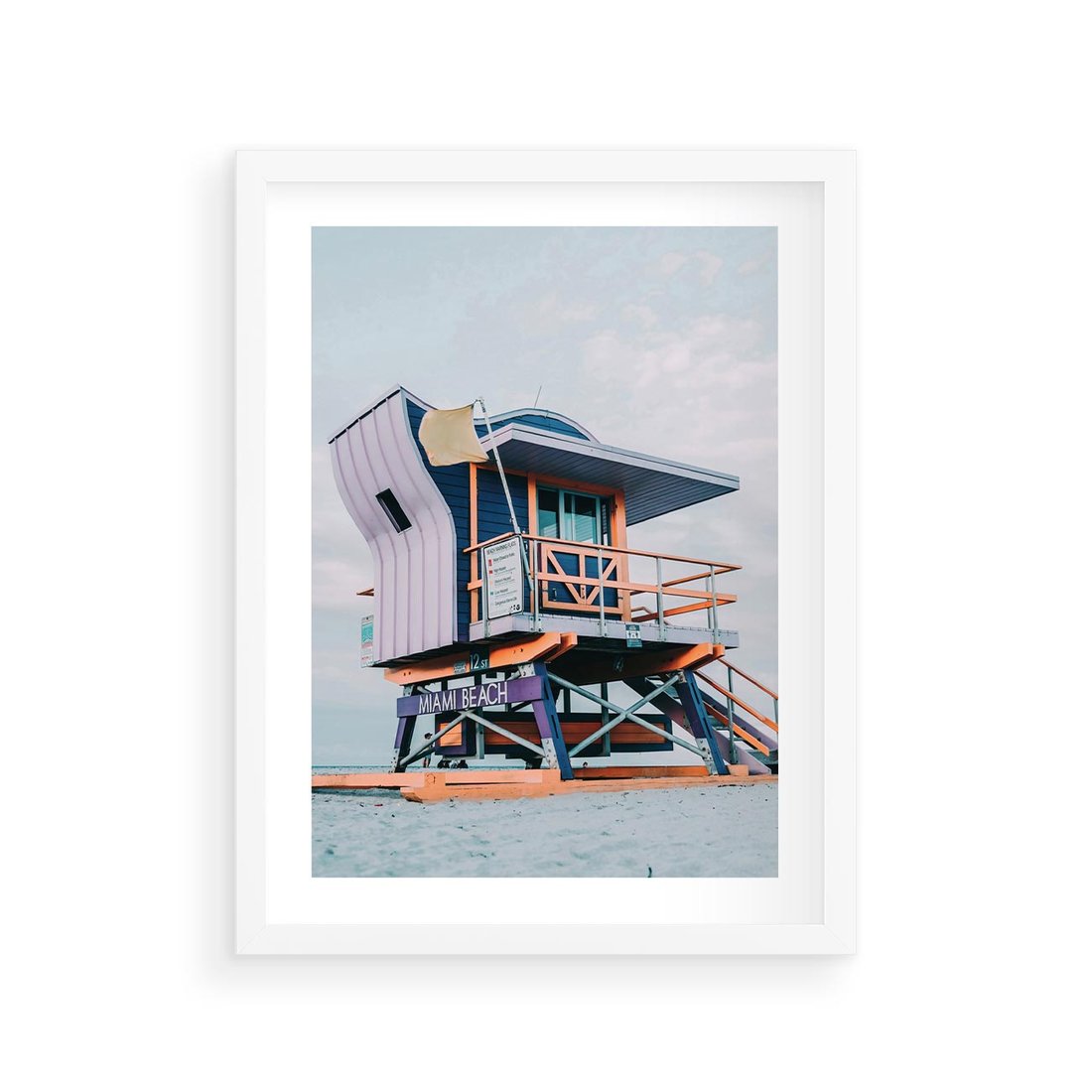 Plakat w ramie 30x40 - Plażowa Kolorystyka: Budka Ratownika w Pastelach - pastelowa budka ratownika, plaża Miami - rama biała