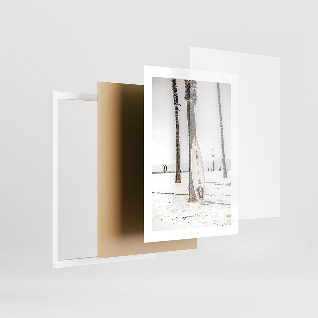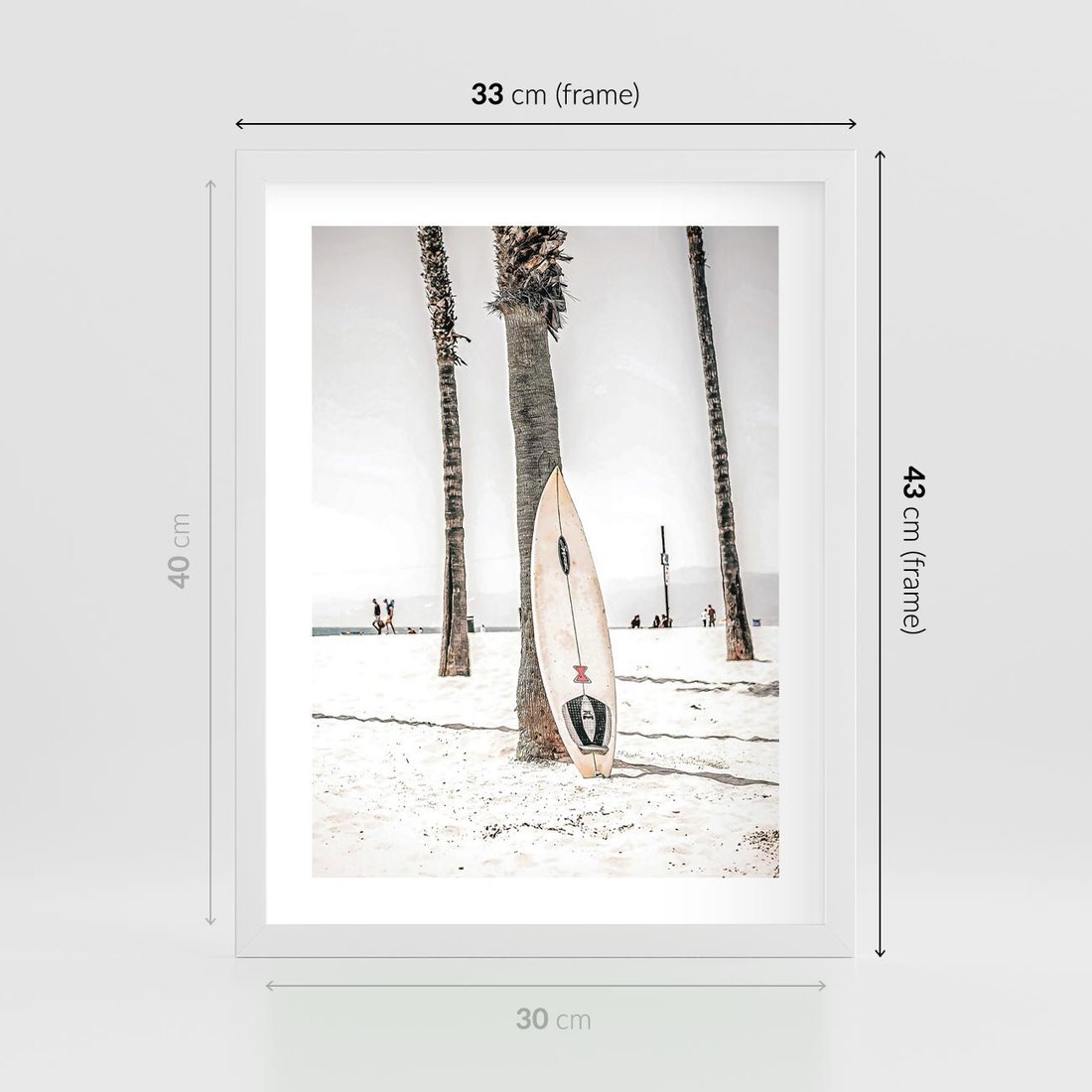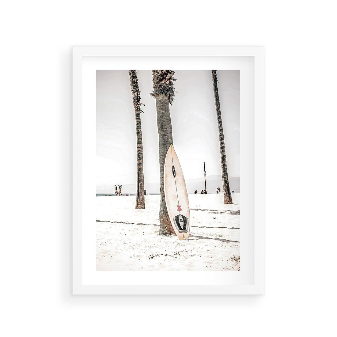 Plakat w ramie 30x40 - Plażowy Relaks - deska surfingowa, oparta o palmę - rama biała