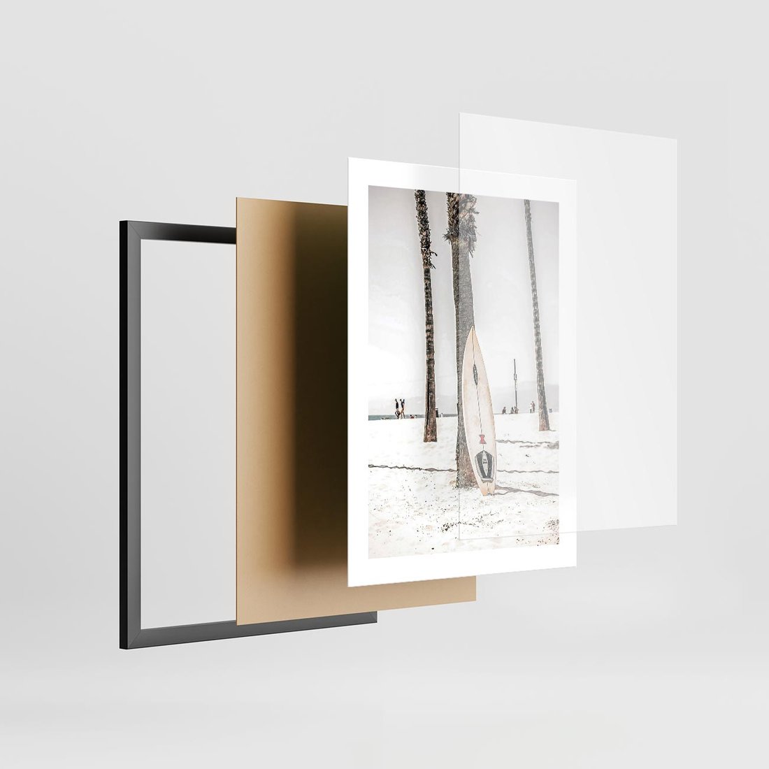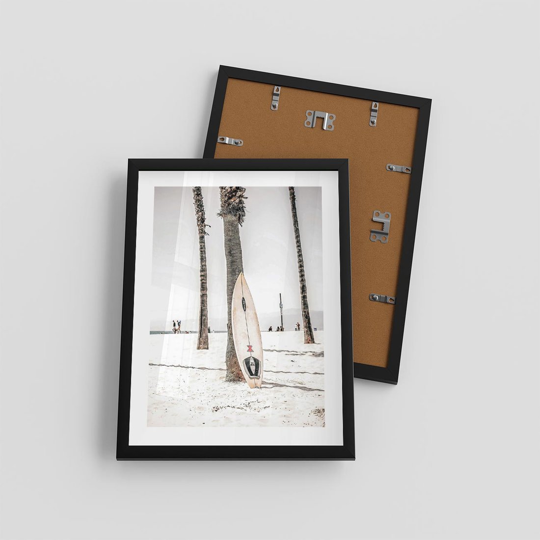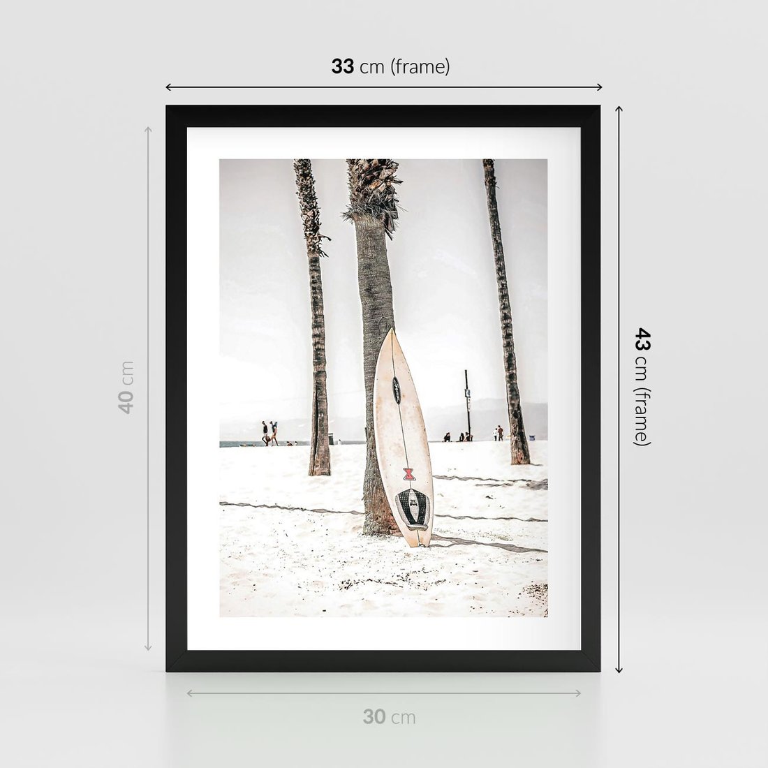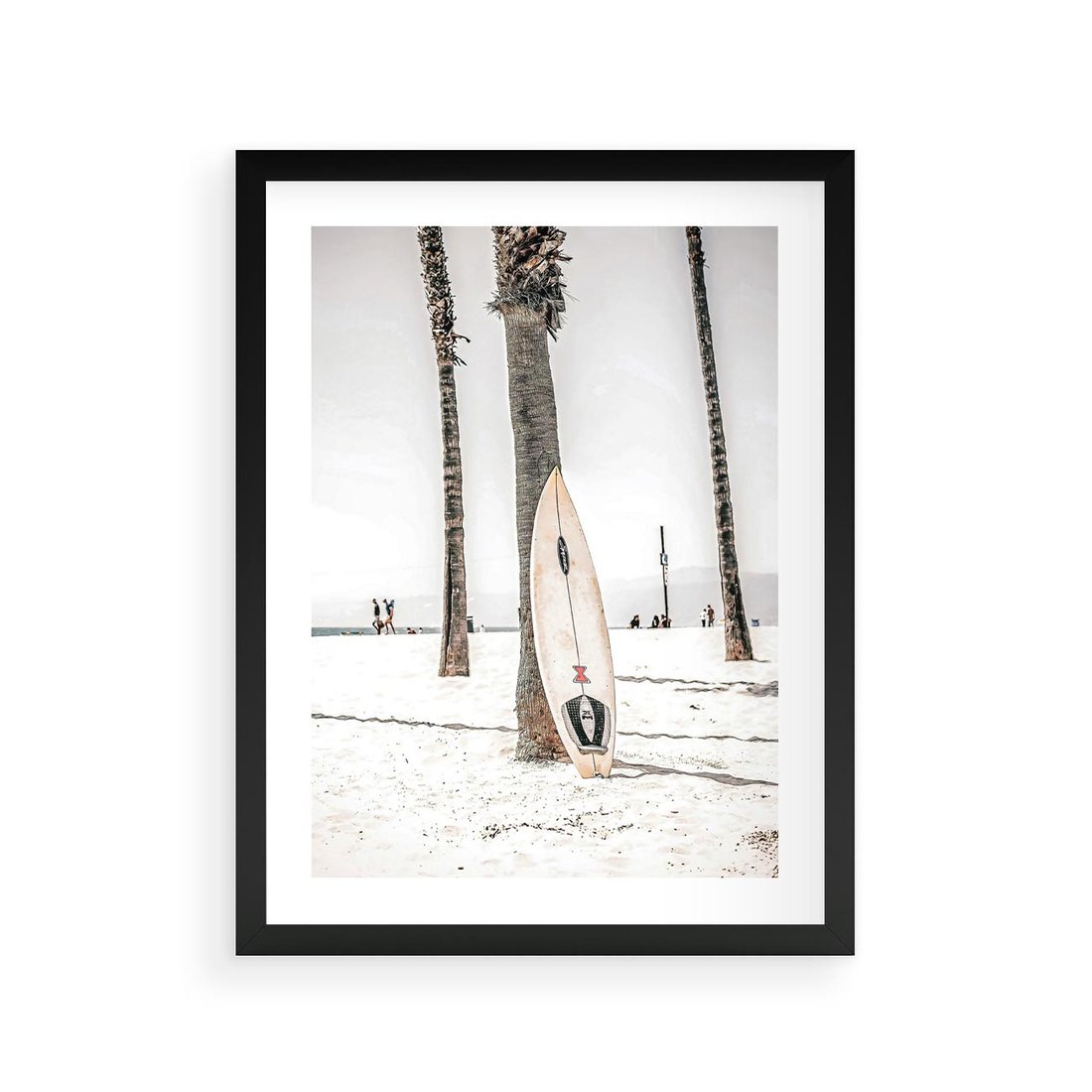 Plakat w ramie 30x40 - Plażowy Relaks - deska surfingowa, oparta o palmę - rama czarna