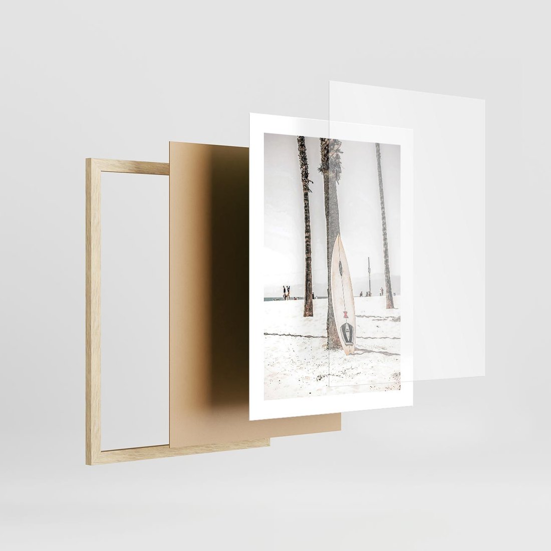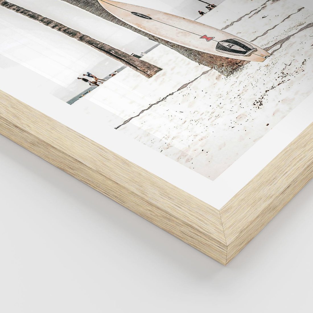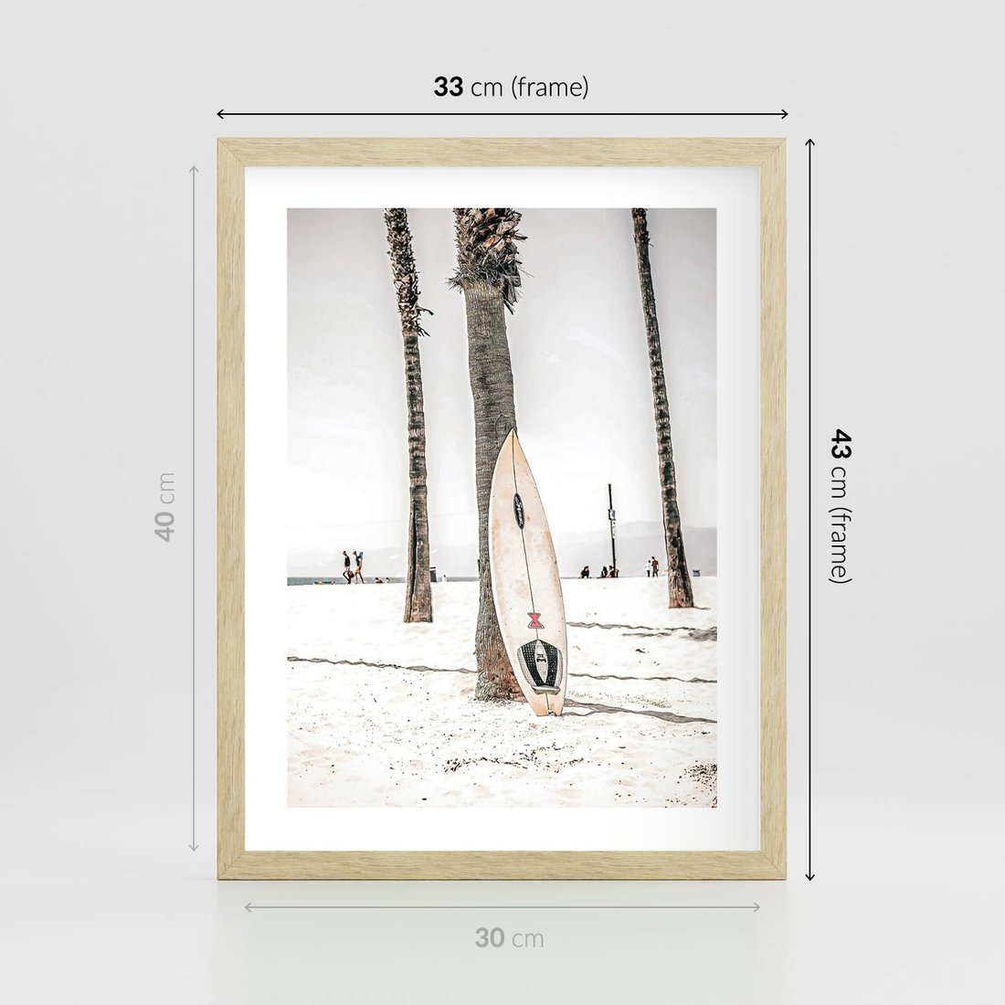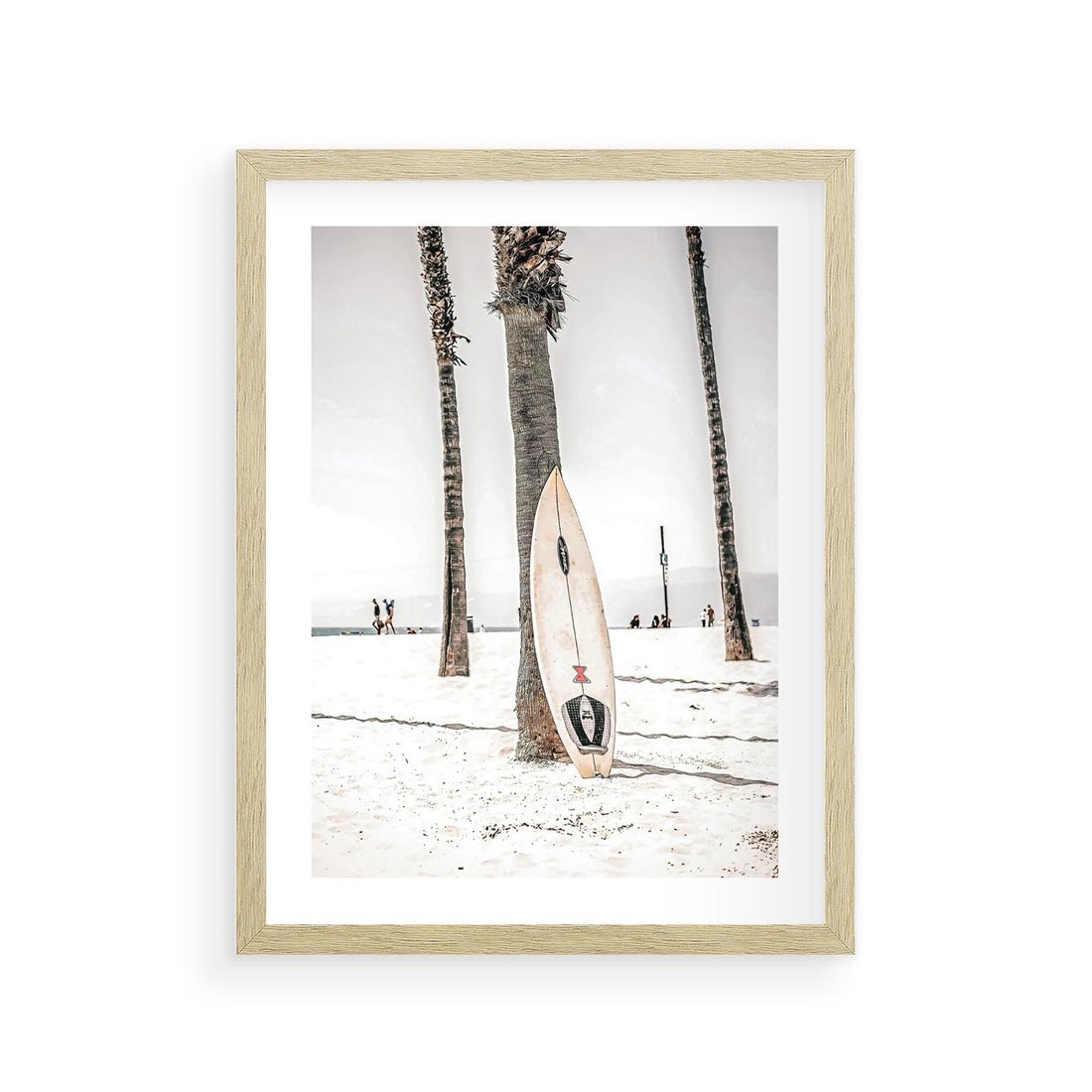 Plakat w ramie 30x40 - Plażowy Relaks - deska surfingowa, oparta o palmę - rama drewno
