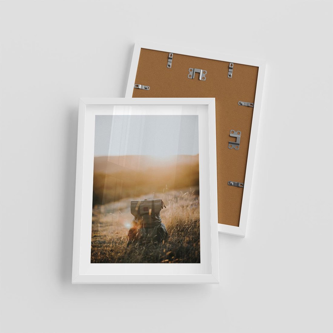 Plakat w ramie 30x40 - Podróżniczy bukiet na łące - plecak, podróż - rama biała