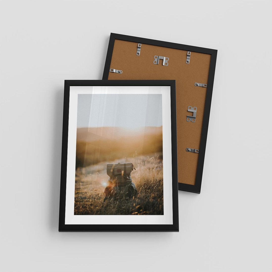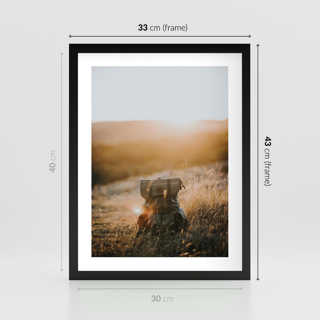 Plakat w ramie 30x40 - Podróżniczy bukiet na łące - plecak, podróż - rama czarna