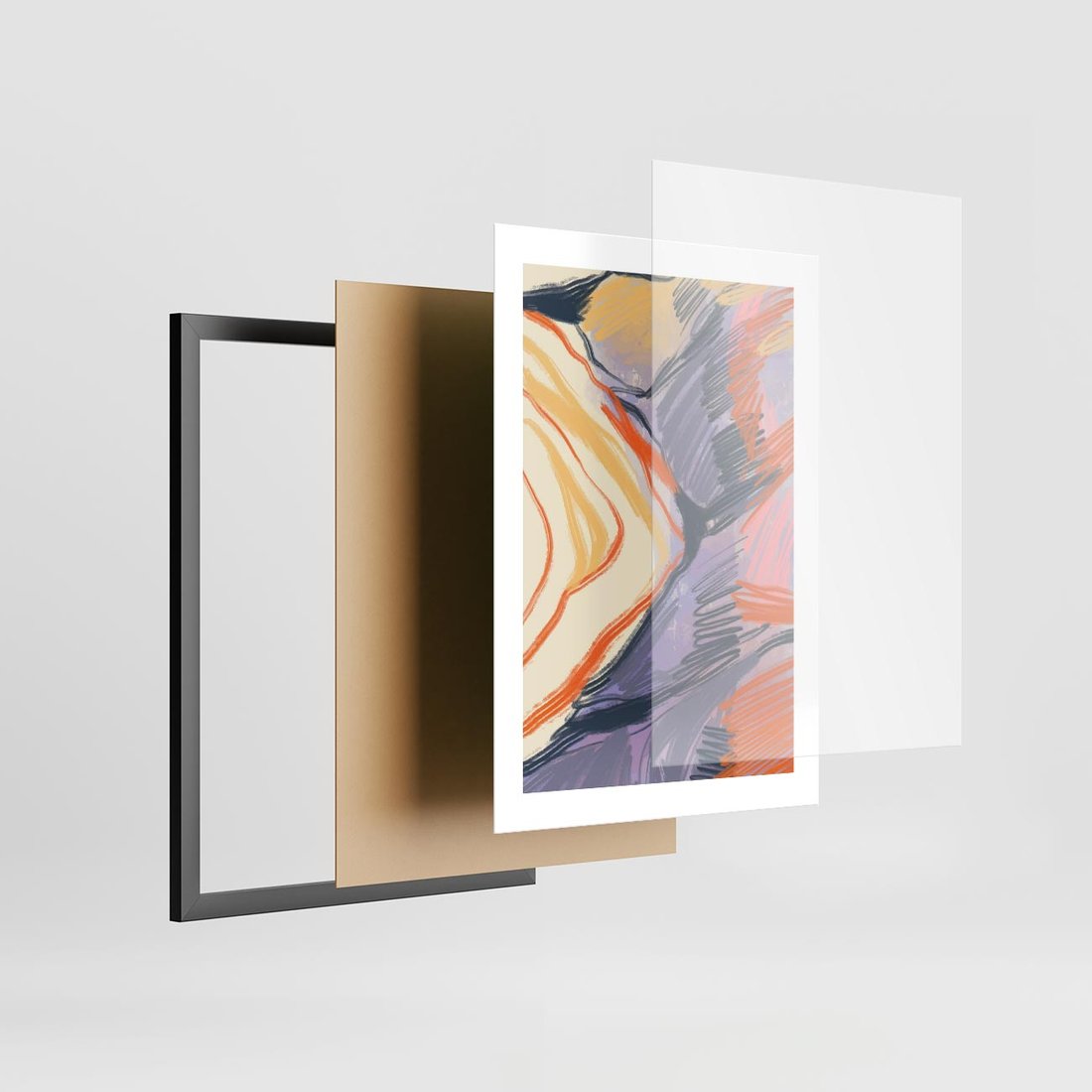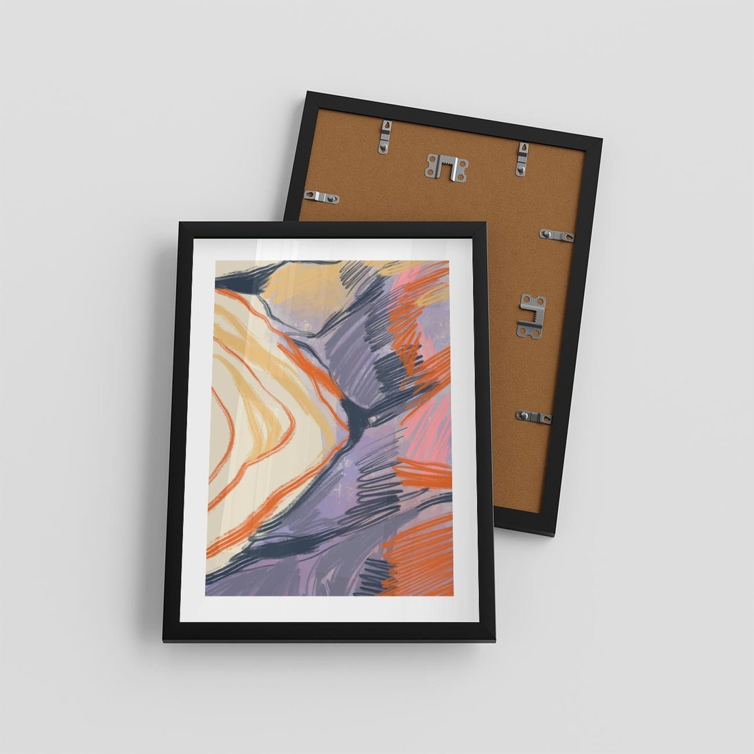 Plakat w ramie 30x40 - Pokreślony Świat - abstrakcyjne formy, odcienie pomarańczu i fioletu - rama czarna