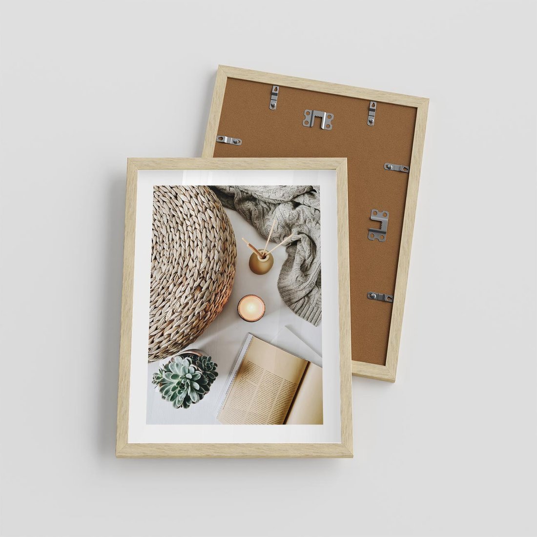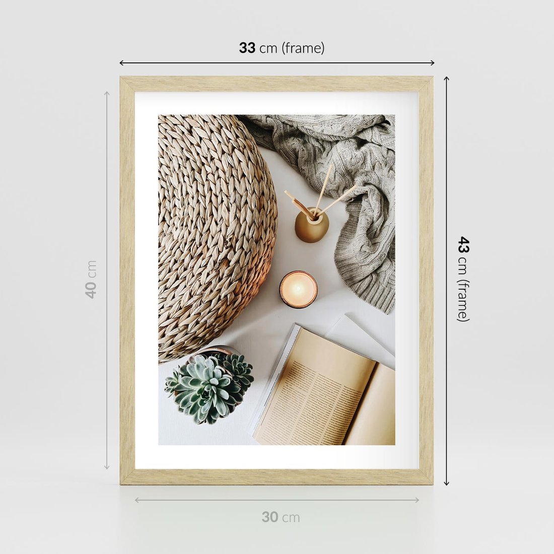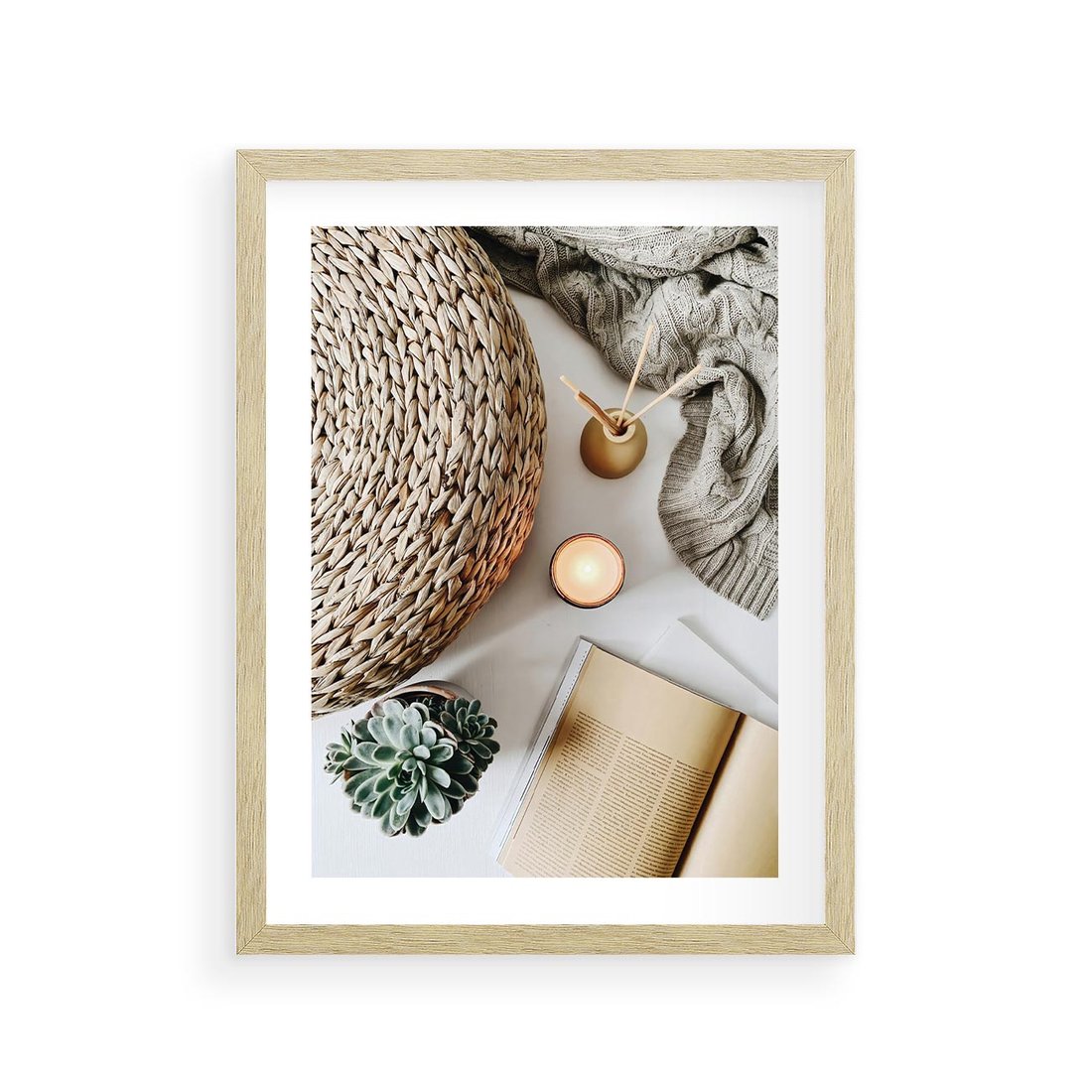 Plakat w ramie 30x40 - Przytulna Kompozycja Lifestyle - kompozycja lifestyle, wiklina - rama drewno