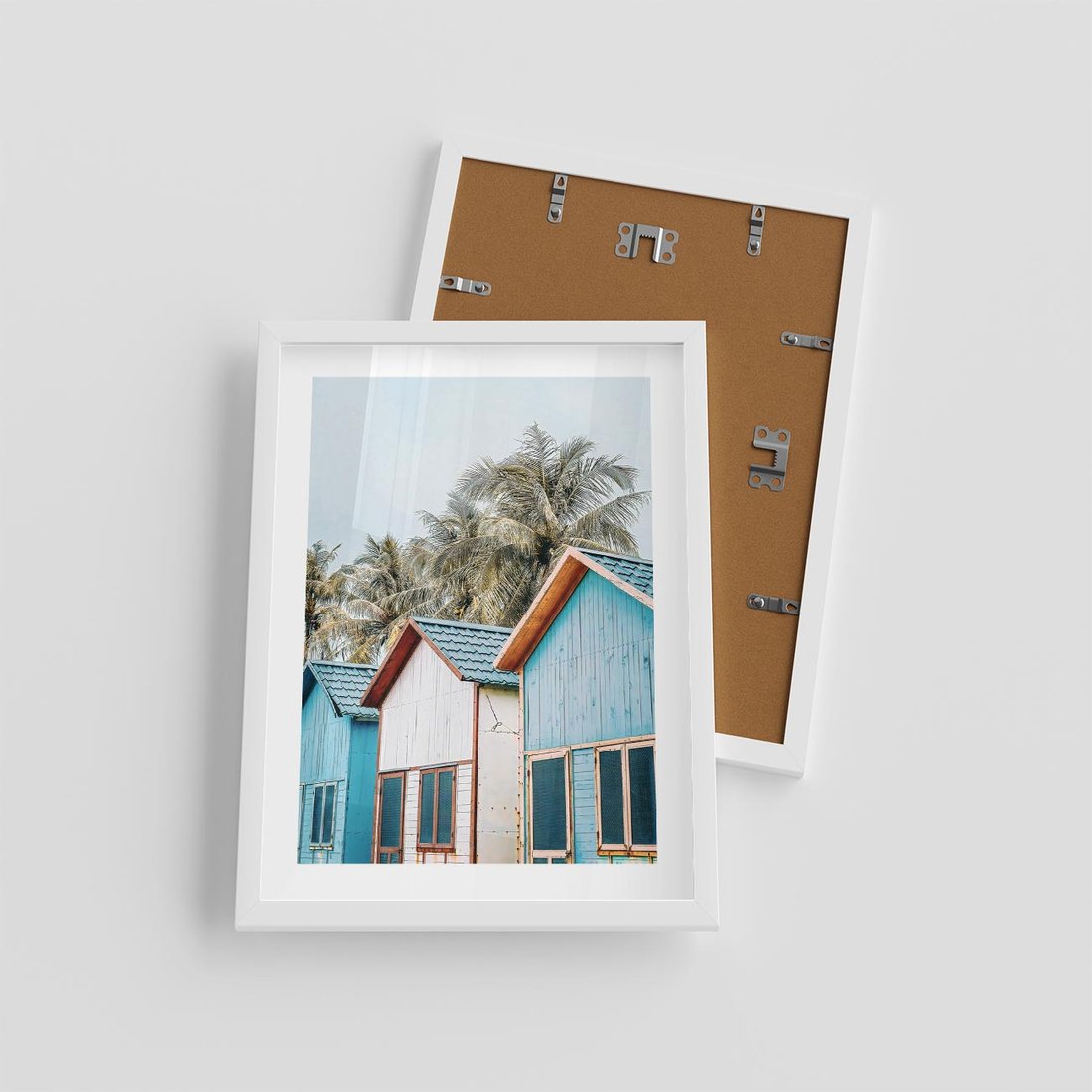 Plakat w ramie 30x40 - Rajskie Wakacje - domki na plaży, błękitne domki - rama biała