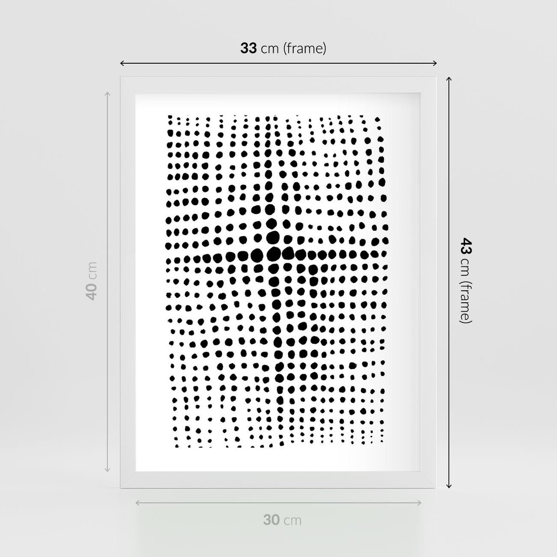 Plakat w ramie 30x40 - Refleksje Monochromatycznych Widoków - abstrakcyjna kompozycja z czarnych kropek, minimalistyczny czarno bialy plakat - rama biała