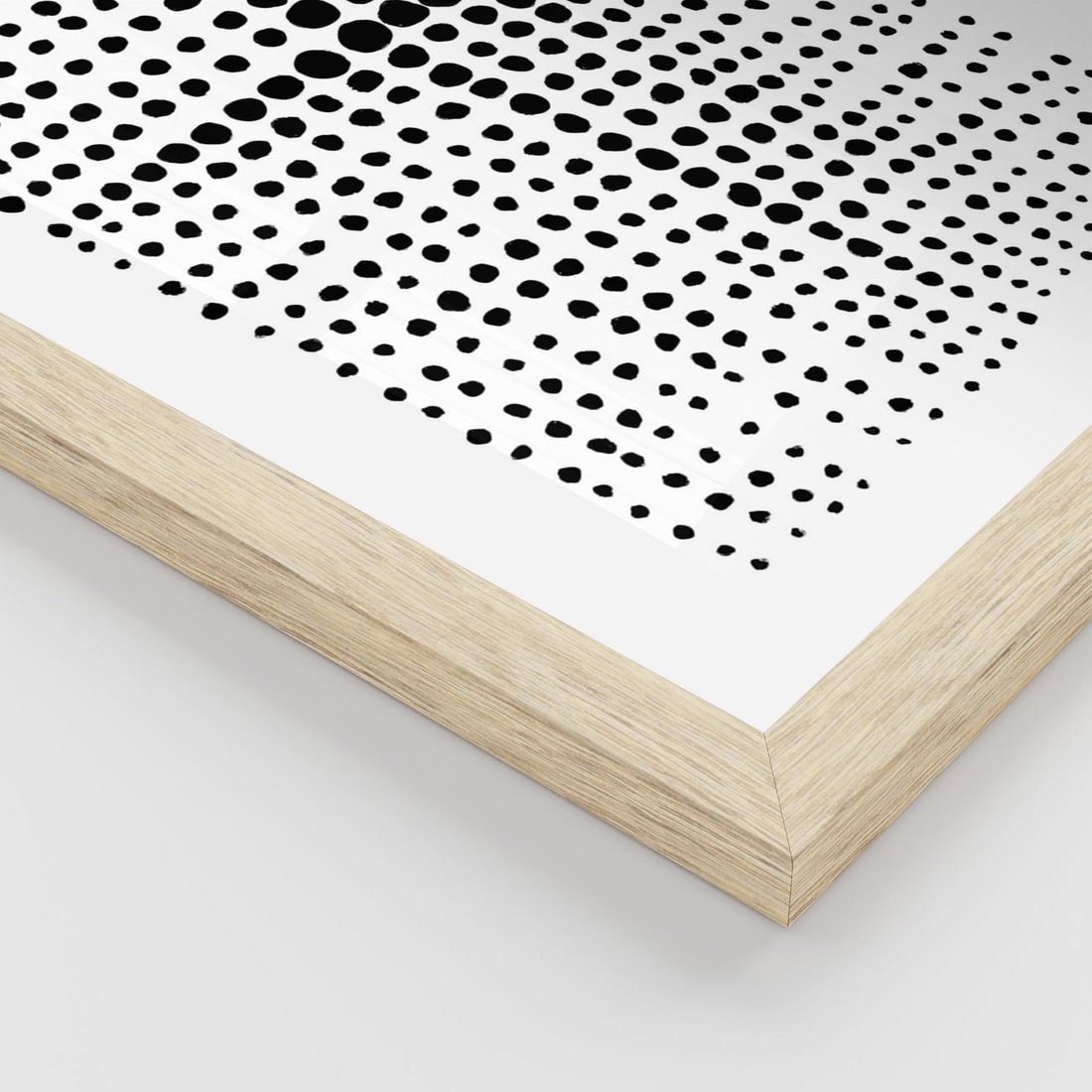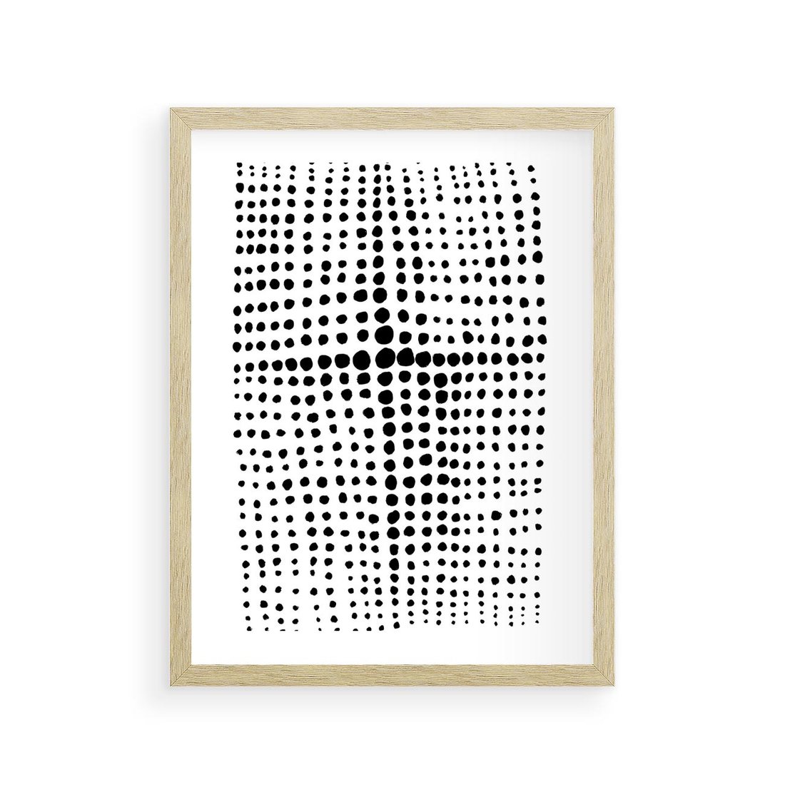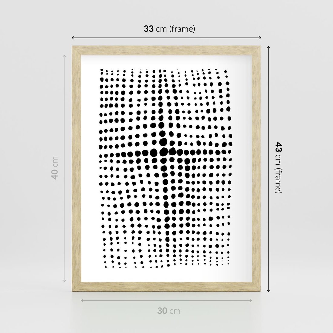 Plakat w ramie 30x40 - Refleksje Monochromatycznych Widoków - abstrakcyjna kompozycja z czarnych kropek, minimalistyczny czarno bialy plakat - rama drewno