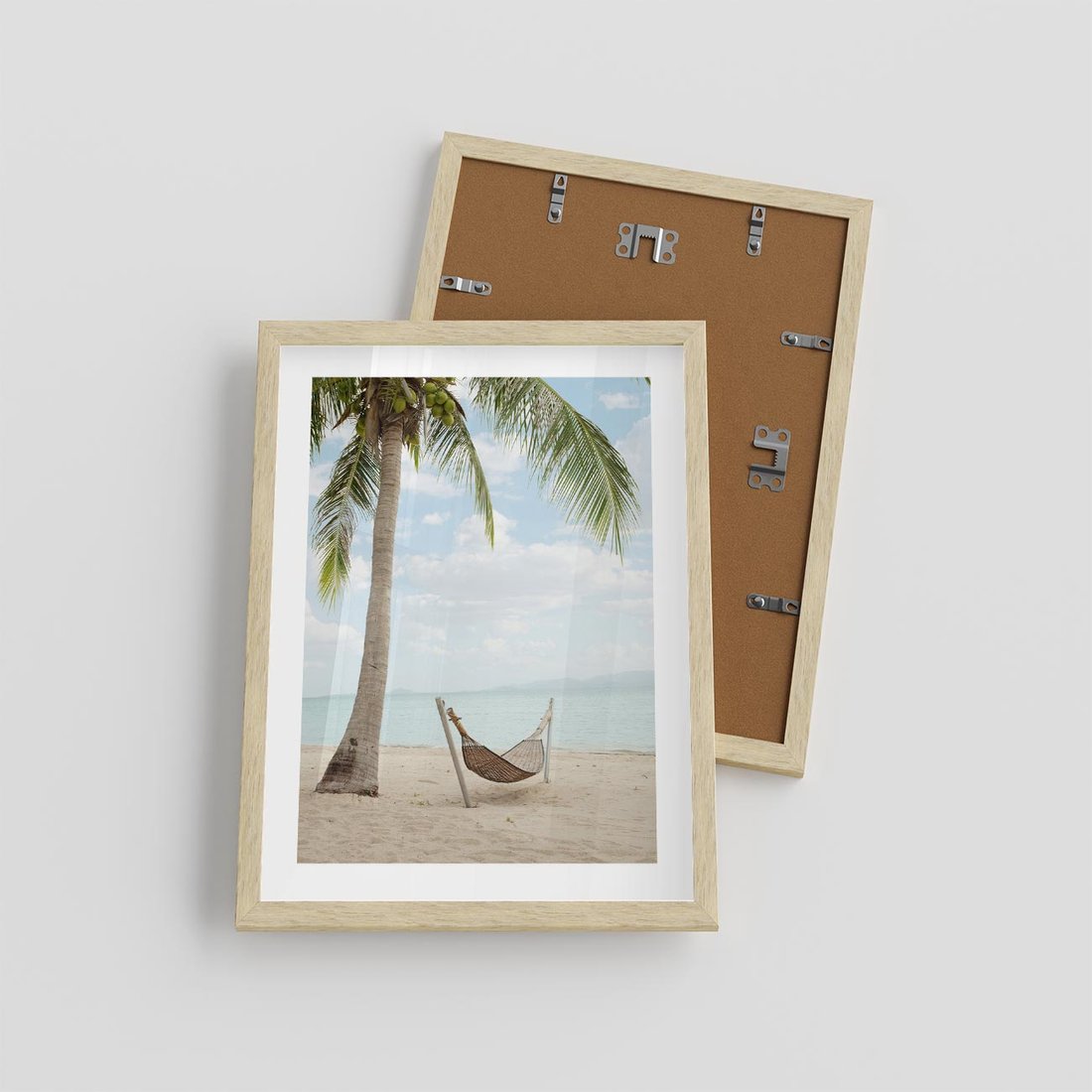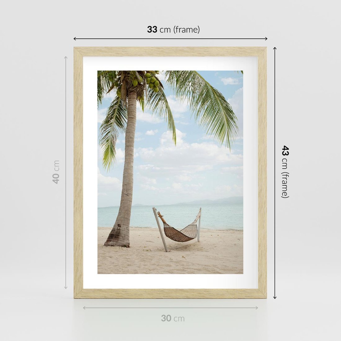 Plakat w ramie 30x40 - Relaks na plaży - palma, hamak - rama drewno