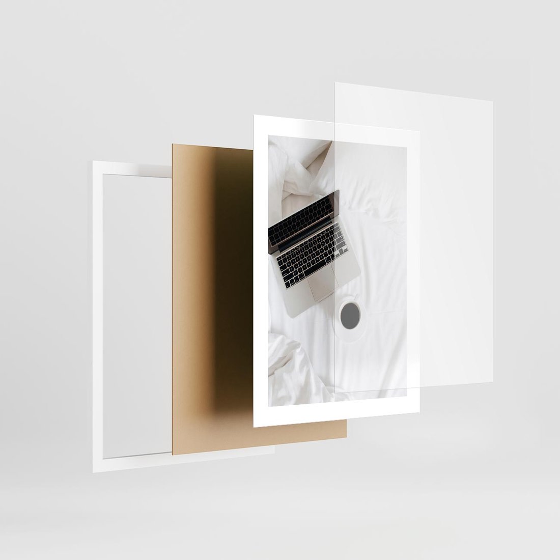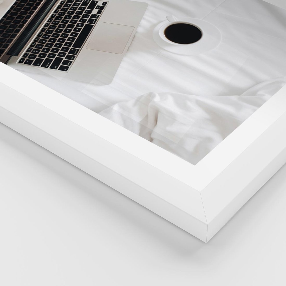 Plakat w ramie 30x40 - Relaks w Łóżku: Kawa i Laptop w Pościeli - komputer, na łóżku - rama biała