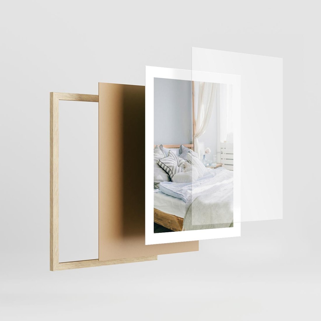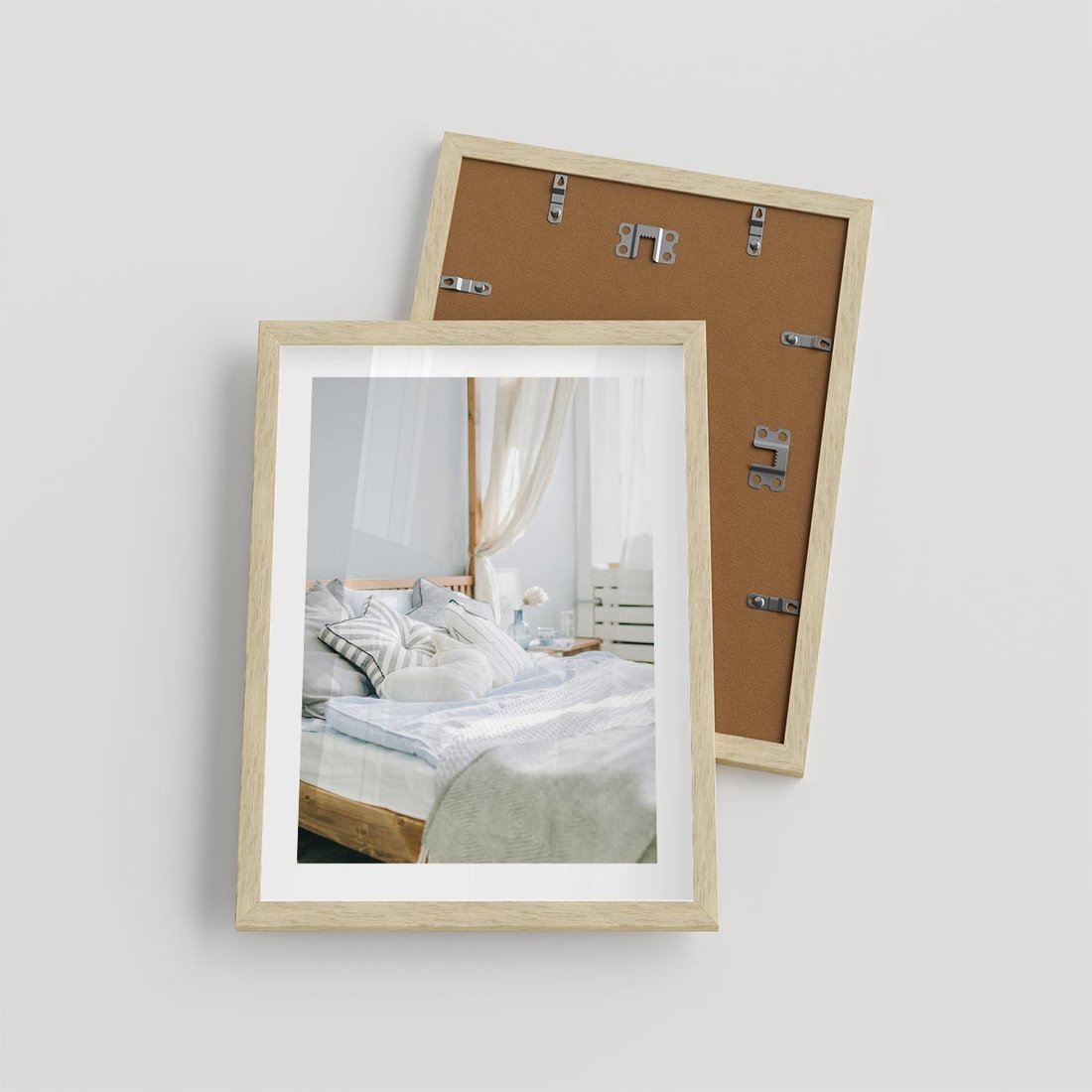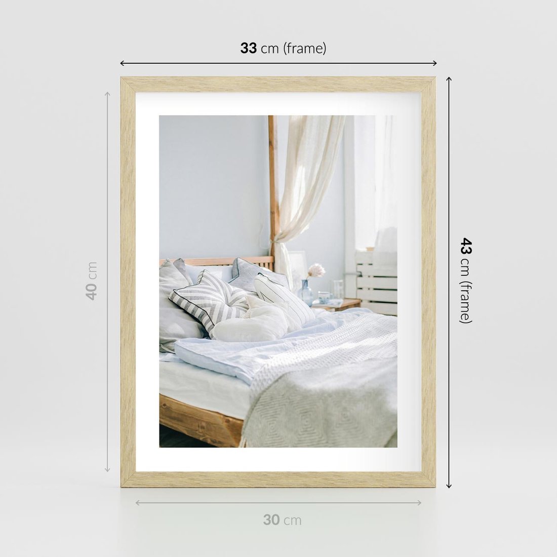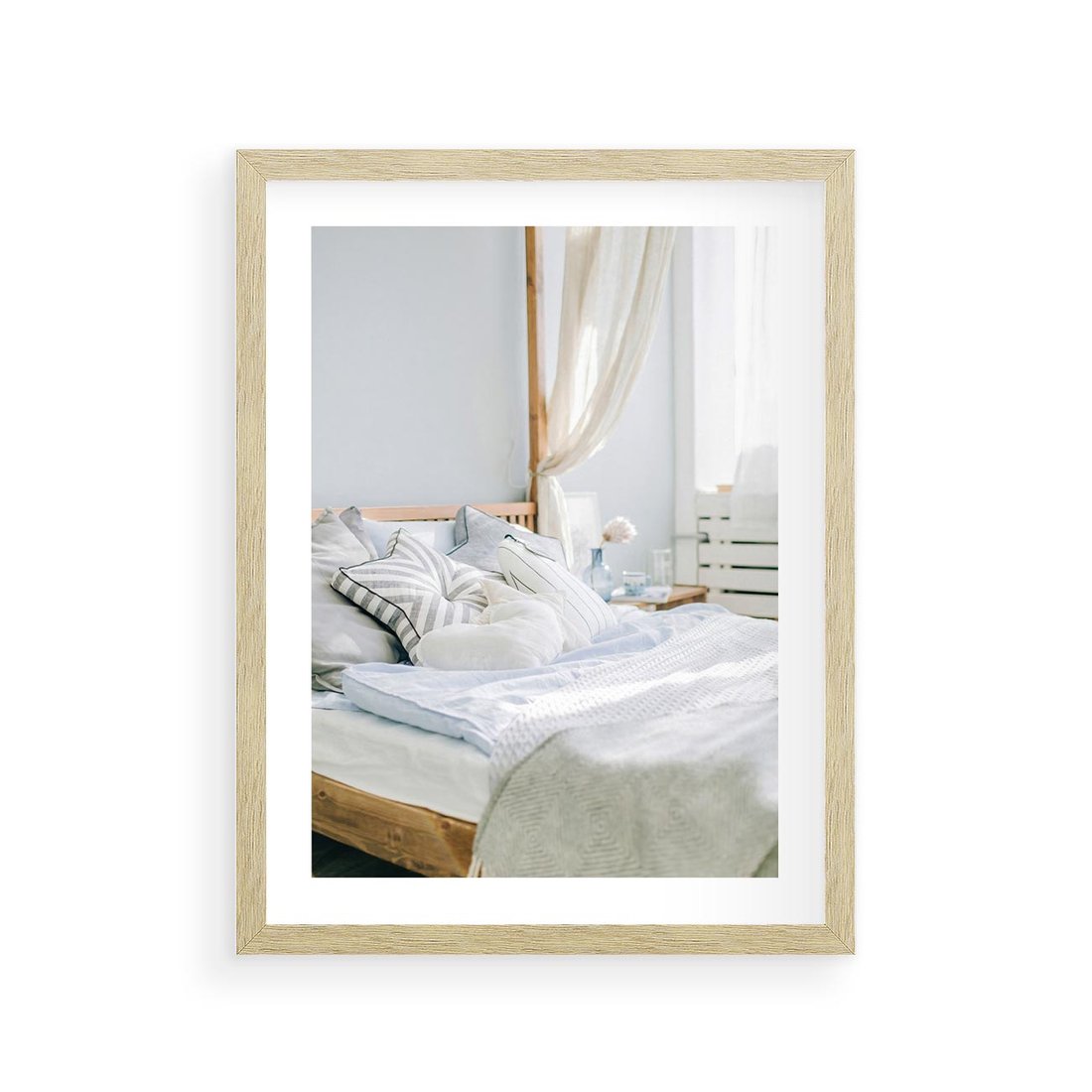 Plakat w ramie 30x40 - Relaks w Sypialni: Jasne Kolory - zdjęcie sypialni, łóżko - rama drewno