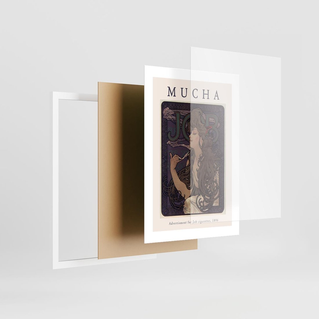 Obraz przedstawia plakat z reprodukcją dzieła A. Muchy. Ta stylizowana i artystyczna kompozycja może doskonale uzupełniać różne wnętrza, dodając im charakteru i oryginalności.