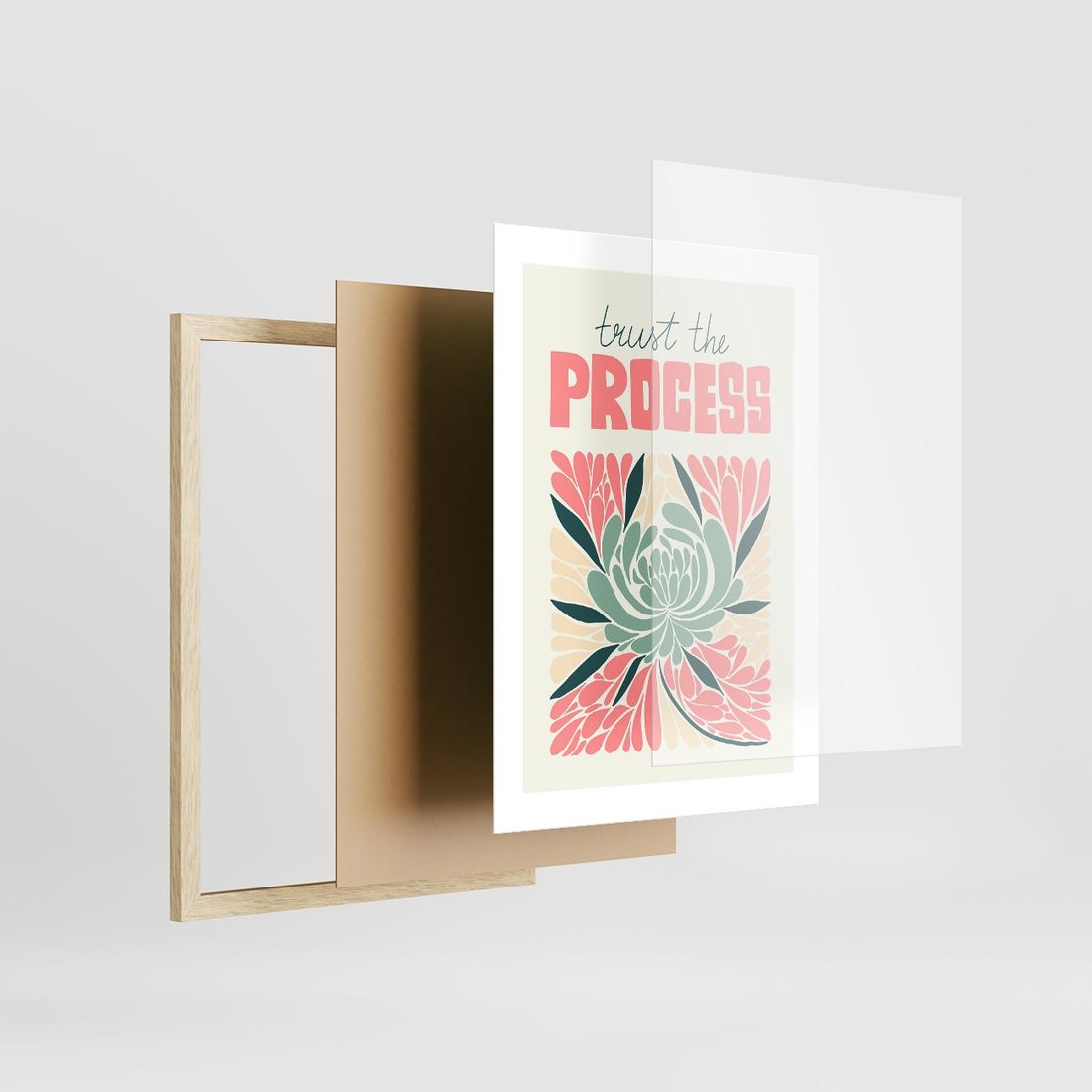 Ta nowoczesna sztuka łączy abstrakcyjny pastelowy kwiat z wyrazistą typografią, tworząc harmonijną kompozycję. Sztuka ta przenosi nas w delikatny świat estetyki, inspirując do refleksji i postrzegania piękna w subtelności.