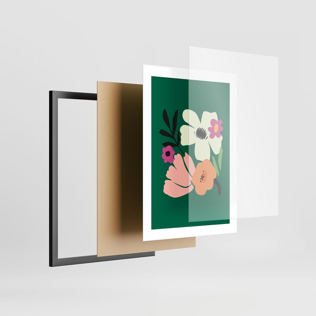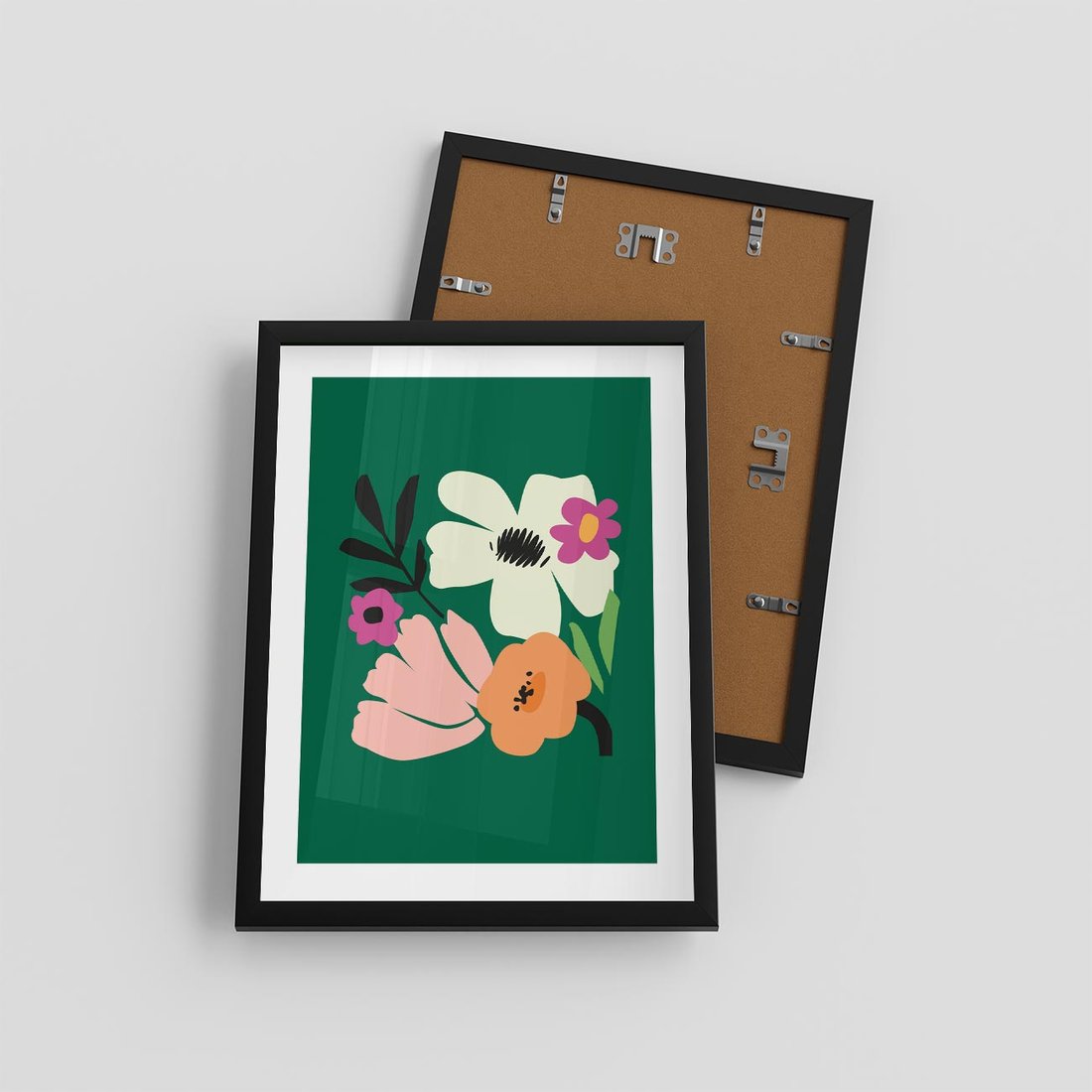 Ten nowoczesny plakat przedstawia abstrakcyjne kwiaty na spokojnym, zielonym tle. Kompozycja ta przynosi do przestrzeni oddech natury w nowatorski i artystyczny sposób, tworząc unikalny punkt centralny w Twoim wnętrzu.
