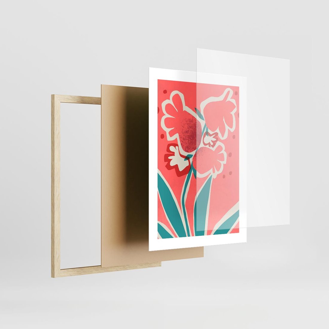 Nowoczesny plakat ukazujący abstrakcyjne kwiaty o odcieniach różu, tworzące dynamiczną i wyjątkową sztukę nowoczesną.
