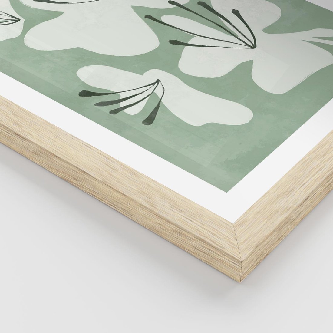 Plakat w ramie 30x40 - Rozkwitające Ukojenie - zgaszona zieleń, kwiaty - rama drewno