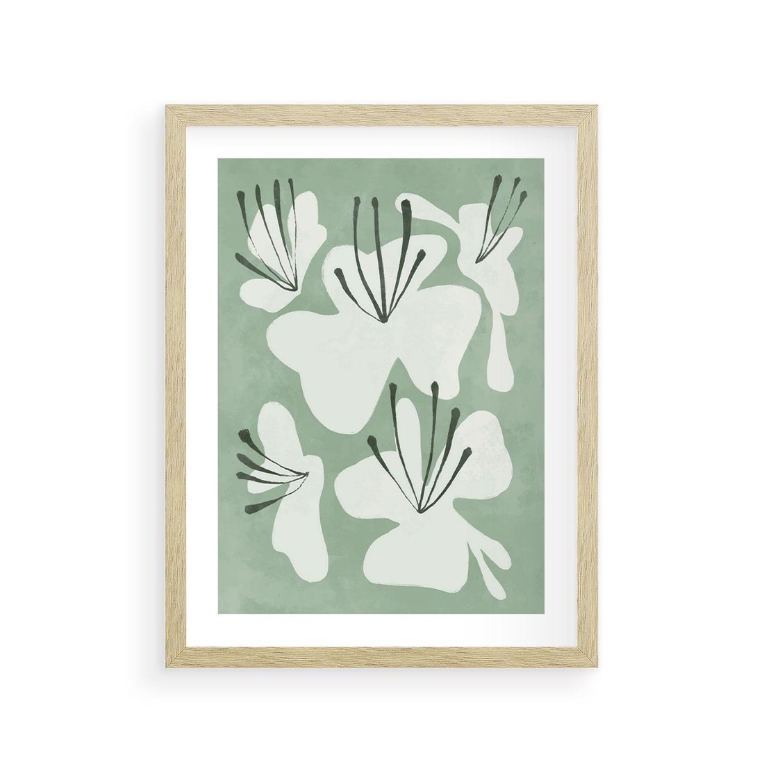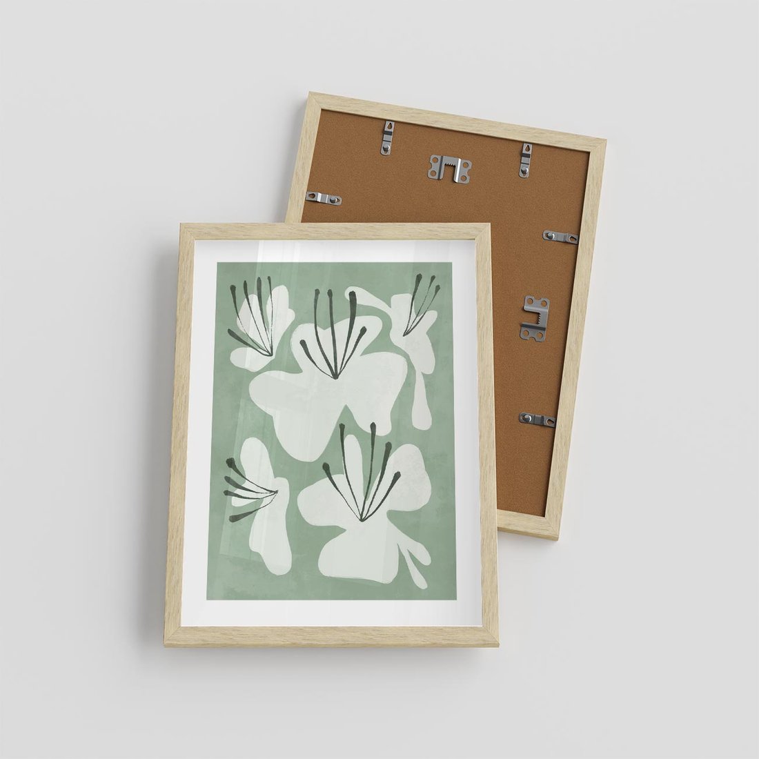 Zgaszona zieleń tworzy tło dla delikatnych kwiatów na tym minimalistycznym plakacie. Ta subtelna kompozycja dodaje elegancji i spokoju do przestrzeni, idealnie wpisując się w nowoczesne wnętrza.