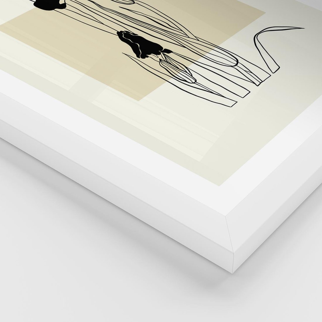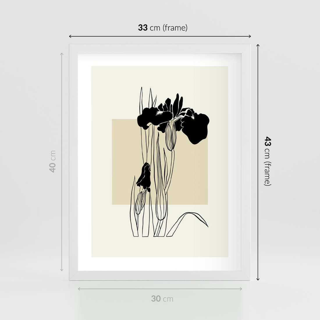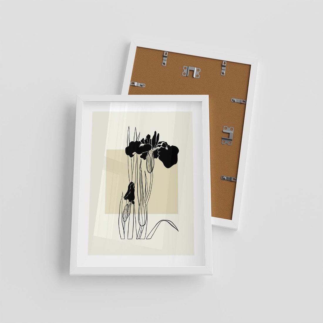 Uchwycenie piękna irysów w minimalistycznej grafice. Czarne kontury tworzą elegancką formę, a beżowe akcenty dodają delikatności. Ten obraz to idealny wybór dla miłośników minimalizmu, pragnących wprowadzić subtelny akcent natury do swojego wnętrza.
