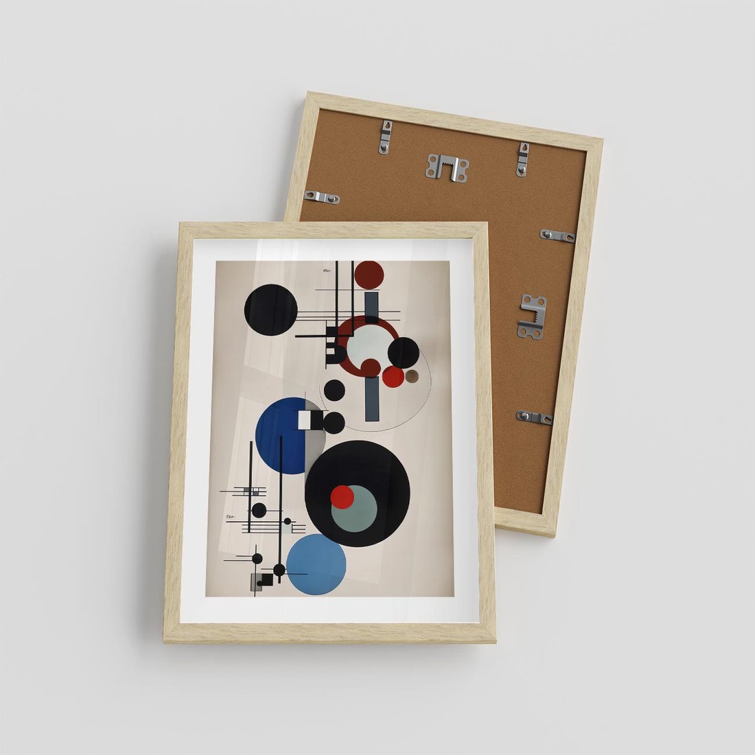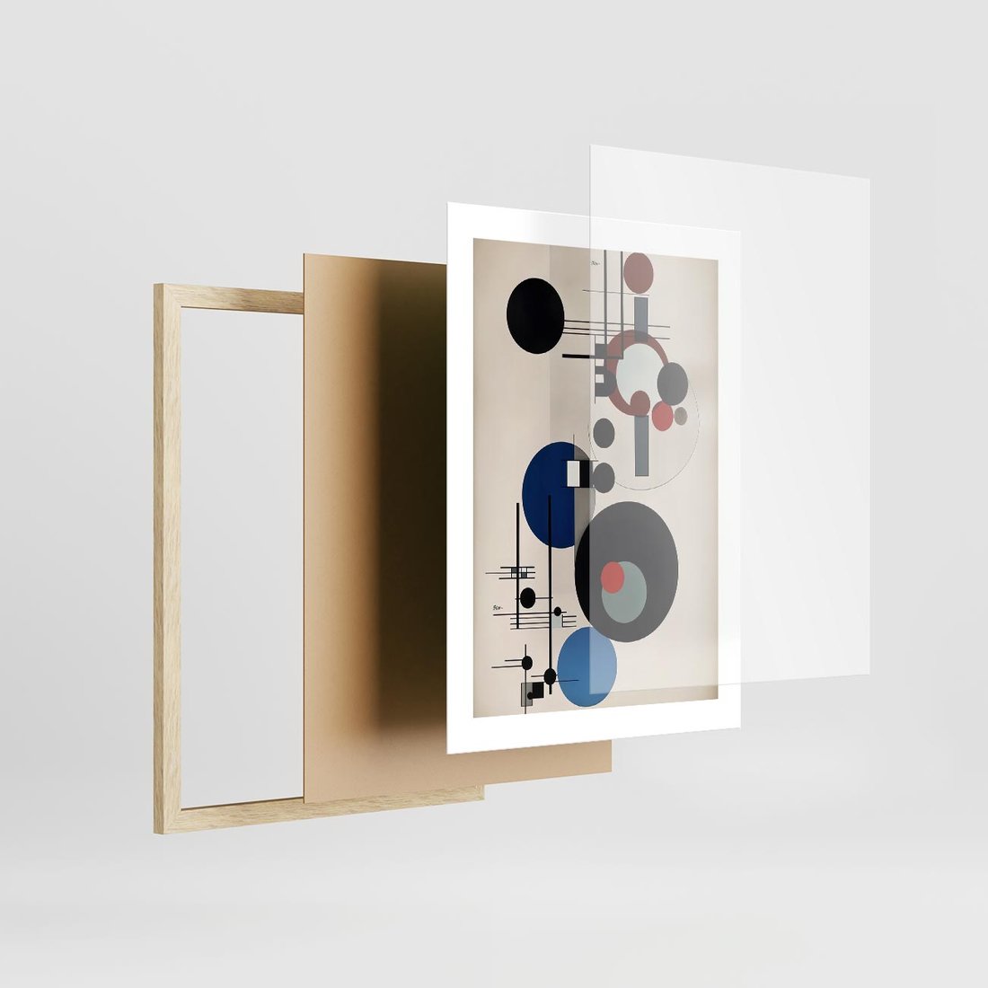 Ta abstrakcyjna geometryczna kompozycja inspirowana stylem Wassily'ego Kandinsky'ego połącza dynamiczne koła i linie w harmonijną całość. Zaskakujące połączenia kształtów tworzą fascynującą podróż wzrokową, podobnie jak w dziełach mistrza abstrakcji. To wyjątkowe dzieło sztuki emanuje energią i pasją, oddając hołd twórczości Kandinsky'ego w nowoczesnym kontekście.