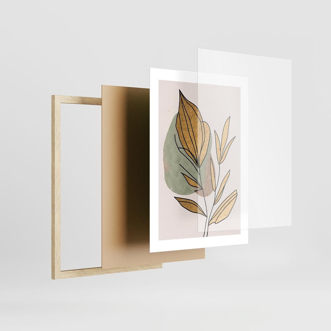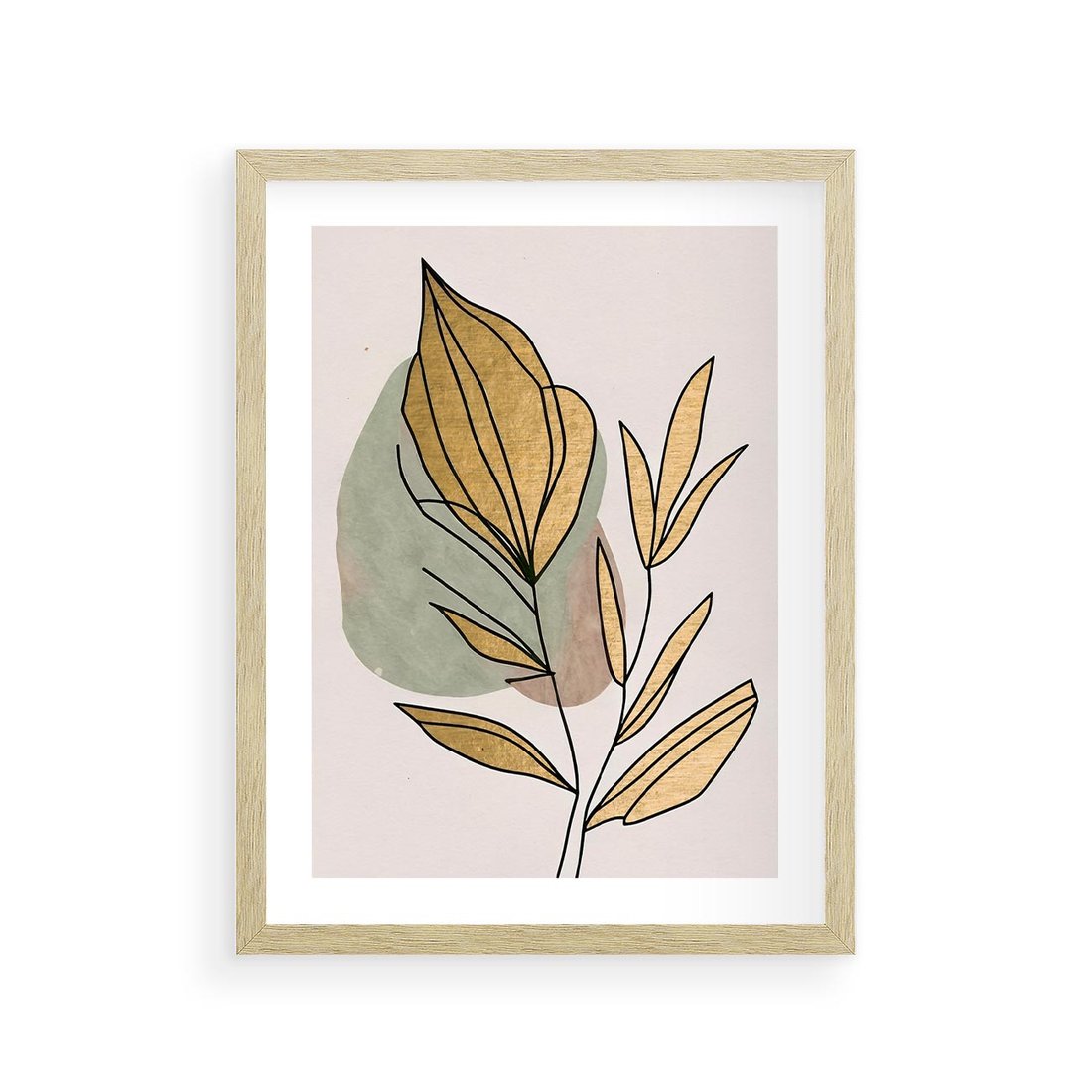 Ten abstrakcyjny obraz w stylu boho jest prawdziwym dziełem sztuki, gdzie liście łączą się z delikatnymi złotymi elementami, tworząc piękny kontrast i harmonię. Złote liście dodają elegancji i blasku, podkreślając naturalne piękno roślin. Kompozycja emanuje subtelnym urokiem i przytulnością, idealnie pasując do różnych wnętrz i dodając im wyjątkowego charakteru.