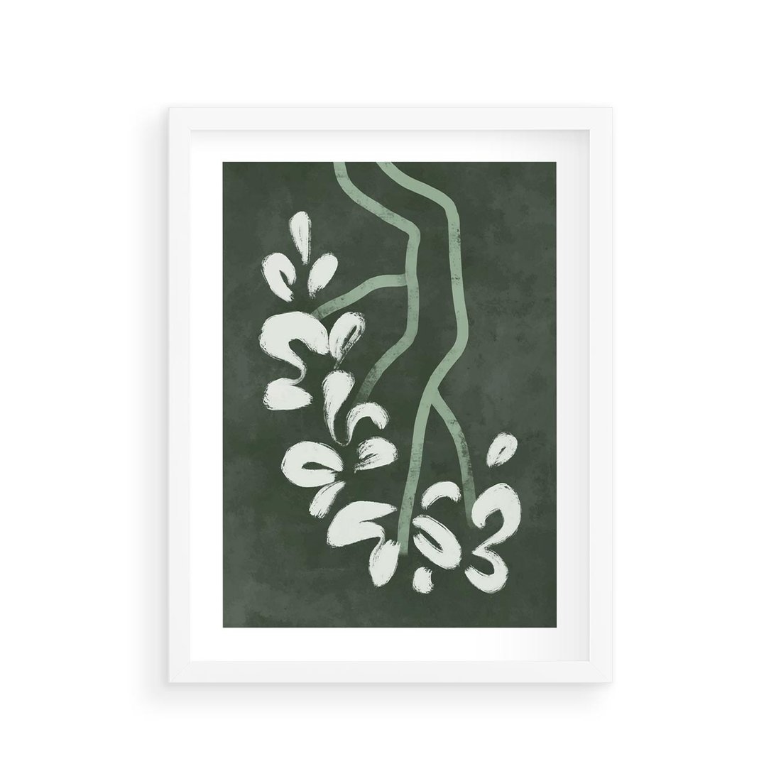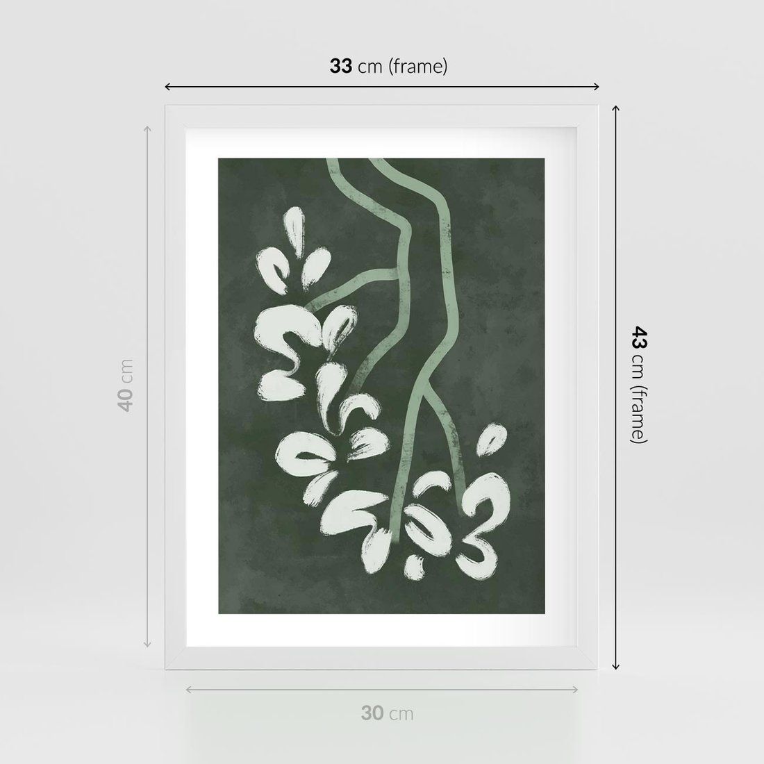 Plakat w ramie 30x40 - Rozkwitające Zielone Gałęzie - abstrakcyjne delikatne zielone linie, podobne do gałęzi kwiatów - rama biała